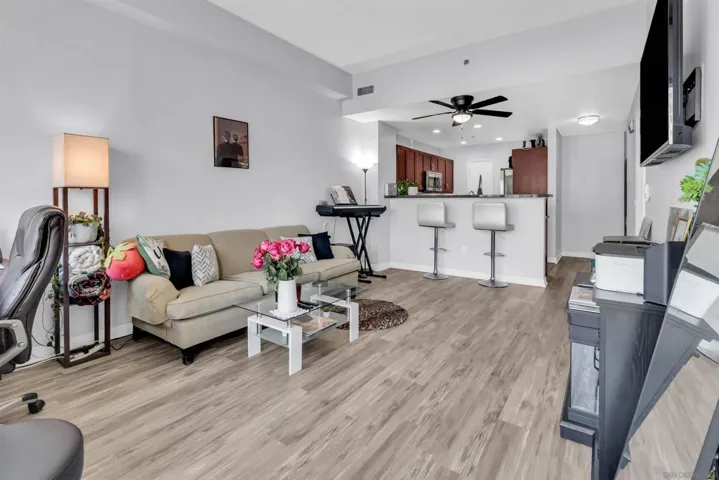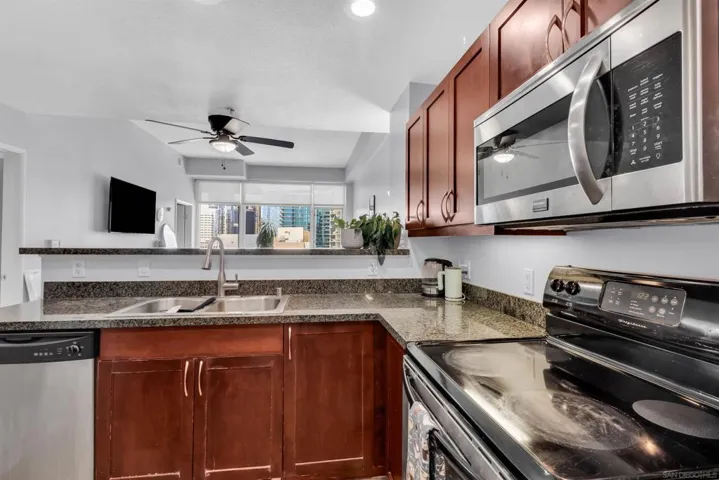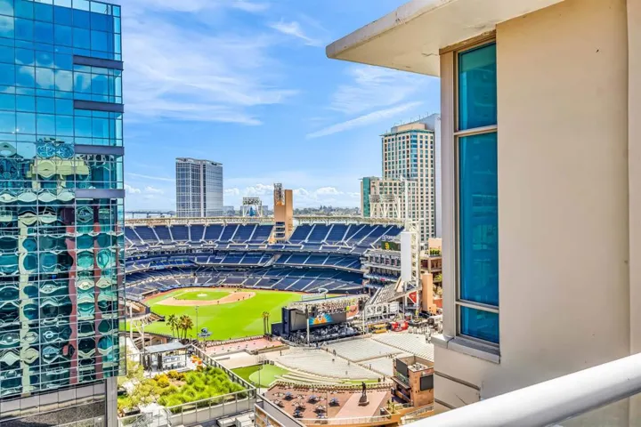 Welcome to this beautifully appointed residence in the heart of downtown San Diego’s East Village. This bright and modern condo offers a perfect blend of comfort and urban sophistication. Step inside to find an open-concept living space with large windows that fill the home with natural light and showcase breathtaking city views. The contemporary kitchen is equipped with granite countertops, stainless steel appliances, and rich wood cabinetry, making it ideal for both cooking and entertaining. The spacious living area flows seamlessly to a private balcony—perfect for enjoying morning coffee or evening sunsets while overlooking the vibrant city skyline. The bedroom retreat features ample closet space, while the bathroom is tastefully designed with granite counters and modern finishes. This secure, amenity-rich building offers everything you need for a dynamic downtown lifestyle, including a rooftop deck with BBQs and lounge areas, a fitness center, and inviting common spaces. Located steps away from Petco Park, top-rated dining, nightlife, and shopping, this home is an unmatched opportunity to live in one of San Diego’s most desirable urban neighborhoods. Don’t miss your chance to own a piece of downtown luxury living!