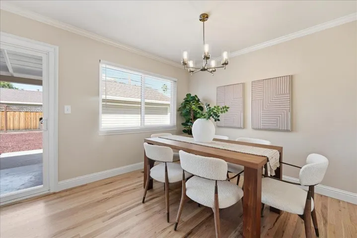 This beautifully updated 3 BR/2 BA home, offering 1,362 SF of comfortable living space, is the perfect blend of style & functionality. Step inside & be greeted by the warmth of refinished hardwood floors & the elegance of crown molding, complemented by fresh interior paint, new lighting fixtures & ceiling fans. Enjoy the convenience of an interior laundry room. The eat-in kitchen dazzles w/granite countertops, cherry cabinetry & stainless appliances. Each bathroom has been tastefully updated w/new vanities & fixtures, shower surrounds, tile flooring & lighting. The living room invites cozy evenings around a tile-front fireplace adorned w/a charming wood mantle. A separate dining area, w/sliding glass doors to the patio, provides the ideal setting for indoor/outdoor family gatherings & entertaining guests. Outside, the detached 2-car garage provides ample space for parking & storage, while the new front landscaping & irrigation system add to the curb appeal. The spacious & private backyard is ready for your personal touch. The possibilities are endless. Location is everything & this home delivers. Close to the Pruneyard, downtown Campbell & Willow Glen, there’s an abundance of dining, shopping, parks & top-rated schools nearby – not to mention easy access to major commute routes.