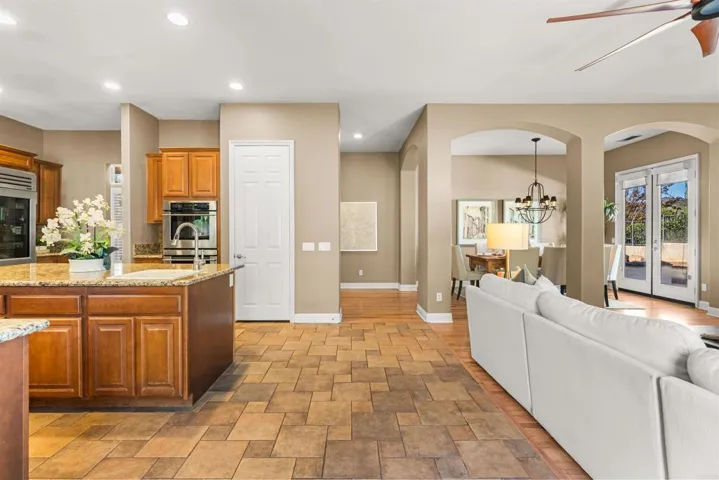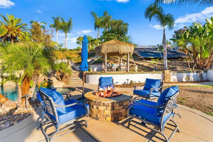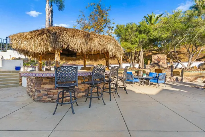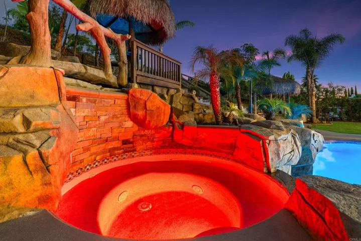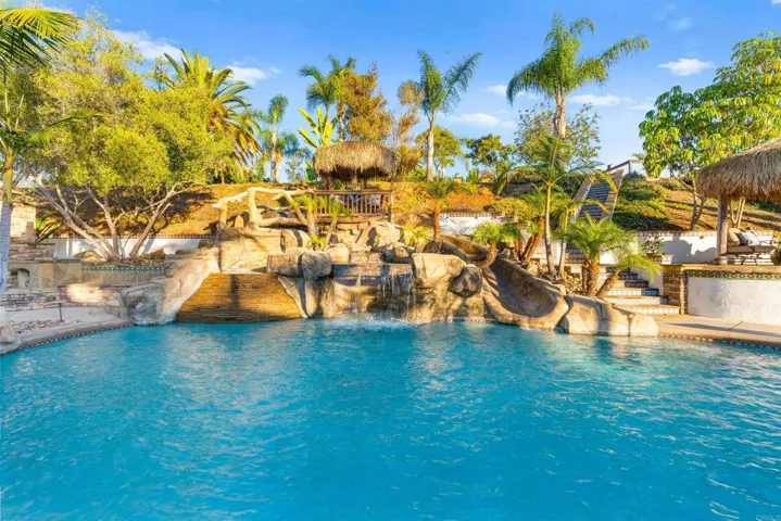 Welcome to the highly sought-after gated community of Rosemont Estates, an exclusive gated enclave of just 18 single-story homes nestled in the heart of Twin Oaks Valley, San Marcos. Each property rests on an acre or more of land, and homes here rarely come to market. In fact, this is the very first time this stunning residence has ever been offered for sale. Designed as the ultimate entertainer’s retreat, this home is truly the perfect gathering place. A Saltillo-tiled walkway leads through a charming courtyard with firepit, arched entry, and tiled fountain, reminiscent of the classic La Costa Spa. Custom tilework accents walls, stairs, and architectural details throughout, setting the tone for the home’s character and style. Inside, striking 10-foot ceilings, laminate wood floors, and tumbled tile highlight over 3,600 square feet of living space. The formal living room with a grand fireplace and adjacent dining room create an elegant setting for entertaining, while the private owner’s wing features a luxurious primary suite with trey ceiling, space for oversized furnishings, and a spa-like bathroom complete with walk-in shower, soaking tub, and dual walk-in closets. The secondary wing offers three generously sized bedrooms, each with remodeled ensuite baths, along with a home office or optional 5th bedroom just off the entry. At the heart of the home, the open-concept design seamlessly connects the gourmet kitchen, featuring a large granite island, Sub-Zero refrigerator, abundant cabinetry, walk-in pantry and bar alcove with wine fridge. Adjacent to the spacious family room, warmed by a stone-faced fireplace and filled with natural light from French doors leading to the backyard. Additional features include a generous laundry room, dual-zone HVAC with new ceiling fans throughout, and a well-organized two-car garage with overhead storage plus a separate one-car garage. The crown jewel of this estate is the resort-style outdoor living space. The recently remodeled saltwater pool and spa serve as a private paradise with solar heating, water slide, jumping rock, waterfall, bridge, grotto, and beach-entry shelf. Multiple palapas shade the BBQ, dining spaces, and lounge areas, while an expansive covered patio invites year-round enjoyment. Beyond the pool, the elevated back portion of the property includes a bocce ball court, six large gardening planters, a basketball court with two regulation sized hoops, and breathtaking views enhanced by refreshing westerly breezes. This exceptional home combines privacy, luxury, and unmatched amenities in one of San Marcos’s most desirable communities.