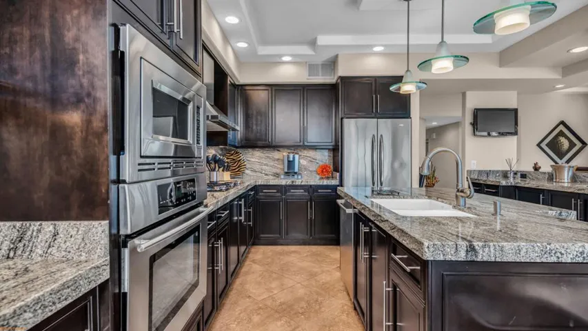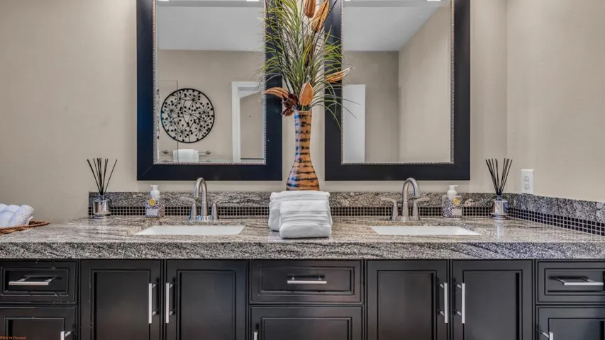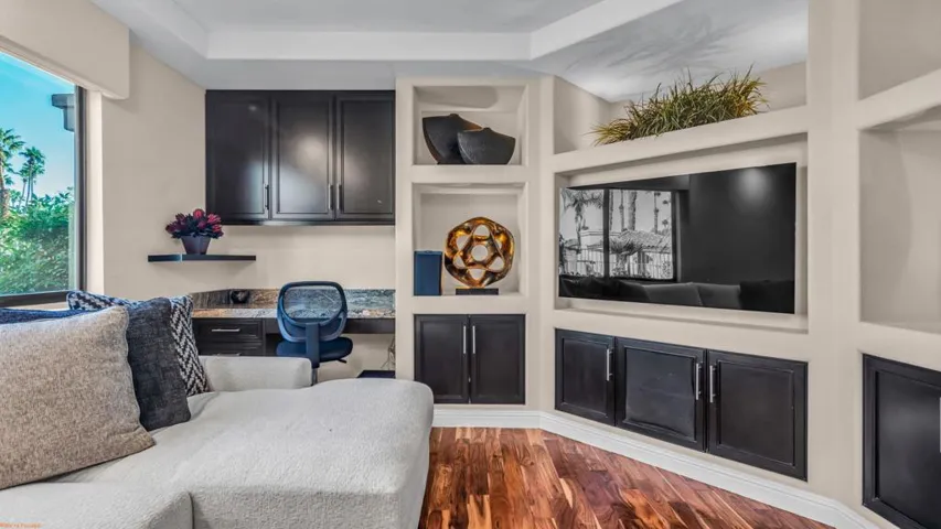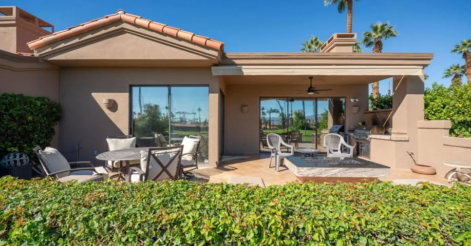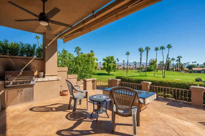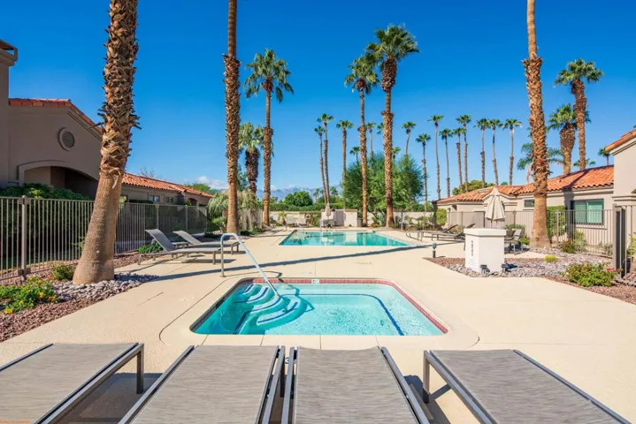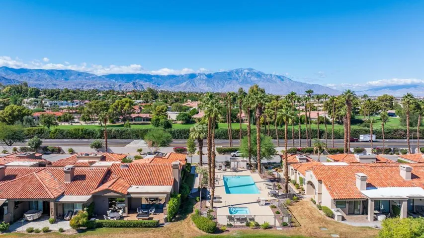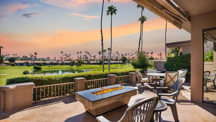 Resort style living every day in your elegant oasis home with private elevated views of the golf course and lake, adjacent pool, lush country club grounds with mountain backdrops, lagoons, and incredible scenery at every turn. This is your opportunity to enjoy a lock and leave lifestyle seasonally or all year round. This home has been lavishly updated throughout including an opening up of the gourmet kitchen to the great room. An ample breakfast counter with wet bar, kitchen island, and chef’s dream appliances fulfill your culinary delights. Dine at the island counter, the dining nook with sunrise views, or the formal dining room that features a spectacular skylight. The hallmark stackstone fireplace anchors the comfortable great room, and a three panel sliding door brings the outdoors in which is a coveted part of the desert lifestyle. All bedrooms are en suite, and there is a powder room for guests. The spacious primary bedroom with vaulted ceiling is all about comfort with an en suite bathroom including large walk-in custom closet, dual vanities, a make-up area, and incredible statement tile shower. A skylight brings soft natural light to the space. The inviting guest bedroom has a vaulted ceiling, with ensuite bathroom that includes dual vanities and a tile shower. The multi-purpose den/bedroom has a polished built-in work space, and large comfortable sectional and ottoman. The adjoining ensuite bathroom has tile shower and closet. The included turnkey furnishings are luxurious – all you need is your toothbrush and you’ll be ready to enjoy! The attached garage is complete with sport floor, cabinets, two car garage plus the golf cart garage, mini-split. Explore the various private membership options for Palm Valley Country Club for golf, tennis, pickleball, fitness, social activities, restaurants and bar, and more. This club is packed with active people of all ages who love the central Palm Desert location close to attractions like El Paseo, Acrisure Arena, Coachella and Stagecoach festivals, PS Airport.