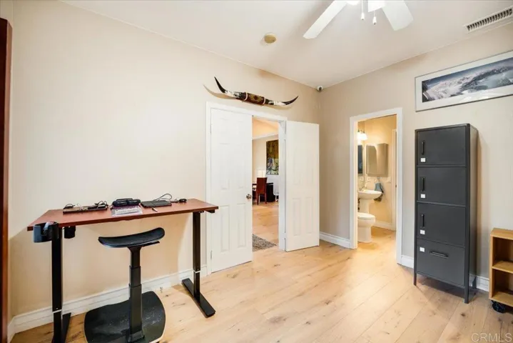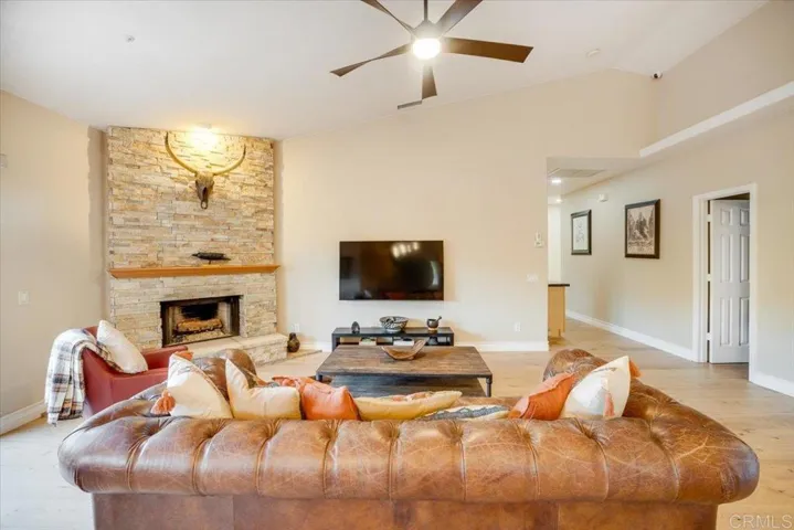 Beautiful and spacious single-level home on the canyon in San Diego Country Estates! Meticulously maintained and thoughtfully upgraded, this property offers serene mountain views, easy-care landscaping, and direct access to nature. Step inside to an open floor plan filled with natural light, vaulted ceilings, and gorgeous engineered wood flooring throughout the main living areas. The remodeled kitchen is a chef’s dream, featuring custom cabinetry, granite countertops, and high-end stainless steel appliances. Both bathrooms have been tastefully updated with newer vanities, granite counters, tile flooring, and modern fixtures. The living room showcases a stunning custom stone fireplace, creating a cozy yet elegant gathering space. Outside, you’ll find a massive 2,400 sq. ft. fire-resistant composite deck that wraps around the back of the home—ideal for entertaining, relaxing with morning coffee, or taking in breathtaking sunrise views. Enjoy afternoon shade on the deck while listening to the sounds of the seasonal creek that runs through the property. Additional highlights include a three-car garage with Tesla EV charger, recessed lighting and artificial turf in the front yard for effortless upkeep. A hiking trail at the edge of the property leads directly to the popular Mount Gower Open Space Preserve, perfect for outdoor enthusiasts. Enjoy the best of country living with all the comforts of a modern home and a low-maintenance lifestyle. San Diego Country Estates offers incredible amenities, including a community pool, golf course, pickleball and tennis courts, equestrian facilities, parks, and scenic trails. Conveniently located near local shops, restaurants, and schools—this home truly has it all!