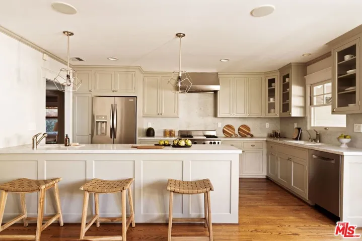 Nestled in the heart of Sunset StripHollywood Hills West, 1438 North Orange Grove is a beautifully preserved Craftsman bungalow that seamlessly blends timeless architecture with modern luxury in Historic Spaulding Square (HPOZ). A gated hedged entry opens to a lush garden oasis framed by manicured boxwoods, mature trees, and white roses creating a tranquil escape from city life. Inside, natural light fills the formal living room, which opens to a versatile office and guest bedroom ideal for hosting visitors or working from home. The elegant dining room flows effortlessly into a bright sitting area, perfect for morning coffee or quiet reading. The home offers 3 bedrooms and 2 bathrooms, including a serene primary suite with marble finishes, a walk-in shower, and generous closet space. The chef’s kitchen impresses with a premium Wolf range, marble countertops, stainless steel appliances, and built-in banquette seating. A charming sunroom leads to the private backyard retreat, featuring a grassy lawn, patio, and a detached studio with its own bath ideal for guests, a creative workspace, or an in-law suite. With refined design, lush landscaping, and an unbeatable location, this Spaulding Square gem captures the perfect balance of historic character and contemporary living.