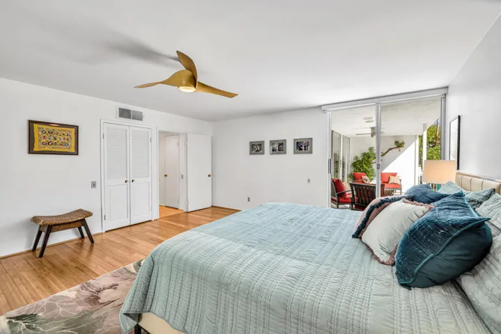 Here’s a rare opportunity to own in this coveted and intimate 14-unit enclave, and final phase of William Krisel’s iconic Canyon View Estates. Condos in this HOA rarely come on the market. This end unit offers one of the largest floor plans in Canyon View Estates with just under 2,000 square feet of living space, and a two-car garage. For modernism enthusiasts, some original features remain. Highlights include the iconic pop-up umbrella roofline with triangular clerestory windows on four sides providing 360-degree views and an abundance of natural light. A double door entry with original iron gates leads to a spacious foyer. The layout includes a large living/dining room, expansive primary bedroom, a generous second bedroom, a den (3rd bedroom) with a wet bar, and two bathrooms with original terrazzo floors, with the primary bath featuring a roman style tub. The expanded kitchen has been updated with a built-in office area with west facing views. There is also interior laundry, and easy access to the private resort style community pool and spa. Enjoy expansive views from the covered patio along with misters to keep cool. Recent 2025 upgrades include a recoated foam roof and resealed clerestory windows.Completed in the late 1960s, Canyon View Estates HOA #7 is located behind a beautiful hedgerow in its own enclosed private enclave set apart from neighboring associations. Situated on a rise, these homes offer spectacular patio views above neighbors to the east and across Indian Canyons towards Southridge and the famed Bob Hope house, as well as south towards the beautiful Andreas Hills. Architectural touches such as native stone, breezeblock inserts, and patterned concrete shadow block highlight the timeless mid-century style. Several homes within Canyon View Estates HOA#7 have opened their doors to Modernism Week tours since 2022, offering mid-century modern enthusiasts a peek inside these classic residences.