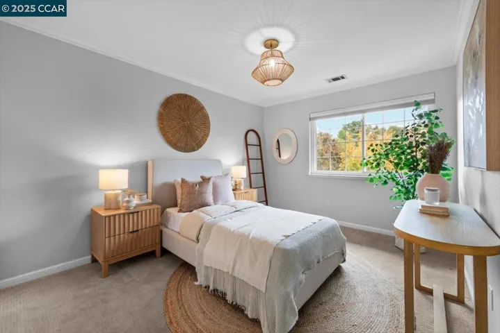 A charming split-level townhouse offering 3 beds, 2.5 baths and approximately 1,884 sq. ft. of comfortable living in the desirable Cresthill community. The open, airy layout features a welcoming living room with luxury vinyl plank flooring, abundant light and a modern gas fireplace with marble surround. A built-in wine fridge/bar area adds a touch of sophistication, perfect for entertaining. The dining area flows into a stylish kitchen with quartz countertops, updated appliances, a vaulted ceiling with skylight and a breakfast bar. A sliding glass door opens to a private, low-maintenance backyard with a slate patio, artificial grass and a lemon tree, ideal for enjoying peaceful hillside views. The oversized primary suite offers double closets, ample space for a sitting/work area, and an ensuite bath with dual vanities and a modern walk-in shower. Two additional beds share a dual-access bath with double vanities and a tub. The home also provides exceptional storage with multiple closets and built-in organization options. Additional highlights include a 2-car garage with EV charger and leased solar panels. HOA dues of $660/mo include a pool, tennis courts and walking trails. Close to Briones Regional Park, Iron Horse Trail, top-rated schools, shopping, dining and commuter routes!