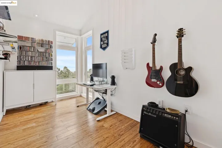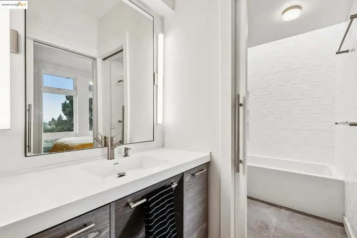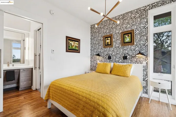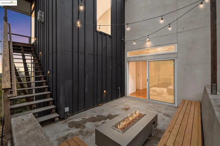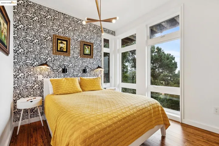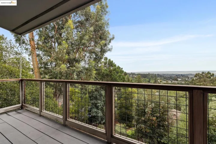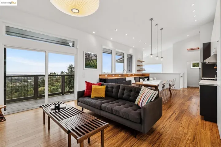 Perched in Oakland’s coveted Sequoyah Hills, this striking modern home feels like a luxe treehouse with panoramic water and skyline vistas. Soaring ceilings and views from every room! Completed in 2020, the home blends sleek design with refined comfort. A vaulted, skylit entry opens to a sun-drenched great room with floor-to-ceiling windows, gas fireplace, and seamless flow to a wraparound view deck and lower patio with built-in seating and firepit, perfect for relaxed entertaining. Downstairs, three airy bedrooms and an office boast high ceilings and enjoy bay views through 8′ tall windows, alongside a spacious bonus room ideal for a media lounge, gym, or studio. Luxury finishes and modern systems elevate every detail: in-floor radiant heating, solar power with battery backup and EV charging, smart dim-to-warm lighting, solid-core pocket doors, chef’s kitchen with gas range and soft-close cabinetry, and WUI-rated exterior for wildfire safety. Nature lovers will relish the surroundings and nearby regional parks with hiking trails. Set on a private ¼-acre lot with two off-street parking spaces and bike storage, this home offers tranquility, technology, and timeless sophistication, all moments from Sequoyah Country Club and the Oakland Zoo. Clear Termite & Sewer Lateral Compliance.