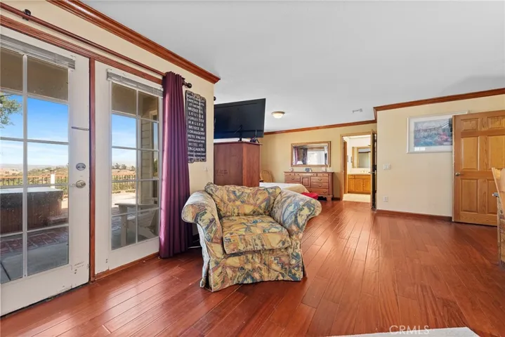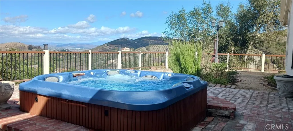 De Luz property- Nestled on a sprawling 5.15-acre lot in a desirable area of Temecula five minutes from Old Town, this scenic single-story residence offers a tranquil, large-lot lifestyle with exceptional potential. The main level of the home provides a comfortable layout featuring 3 bedrooms and 2.5 bathrooms. The inviting, open-concept design flows through expansive living areas, including a formal dining room and a large family room. Elegant details abound, such as Brazilian Cherry engineered flooring, classic wainscoting, and French doors leading to the exterior. The large kitchen is the heart of the home, featuring oak wood cabinetry, travertine tile flooring, and a convenient butler’s pantry. The adjacent dedicated dining area is perfect for casual meals. Utility spaces include a spacious laundry room with a large porcelain sink, upper and lower cabinets, and matching travertine tile. The luxurious Primary Suite offers a walk-in closet, a dedicated fireplace, and an en-suite bathroom complete with double basins and a relaxing Jacuzzi tub. A unique opportunity exists in the upper level, which features two rooms and a loft—perfect for extra storage or flexible space. Outside, the backyard features extensive brick paving and a 7-foot Jacuzzi-brand hot tub, ideal for enjoying the quiet acreage.