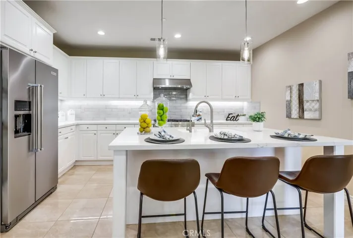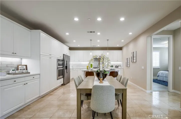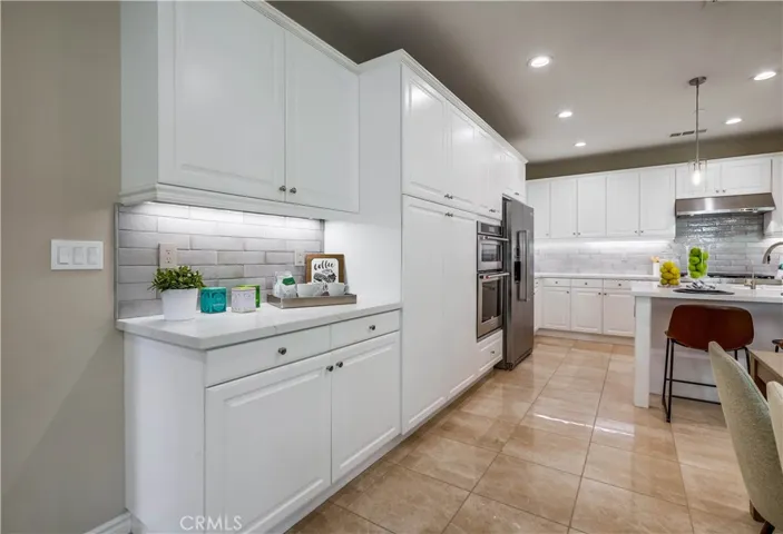 The chef-inspired kitchen boasts top-tier KitchenAid appliances, quartz countertops, and a designer backsplash, blending function with artistry. The space opens into an indoor-outdoor California Room patio — complete with a ceiling fan and elegant lighting — ideal for entertaining, family dinners, or peaceful evenings under the Orange County sky.