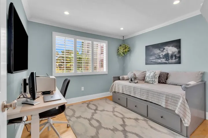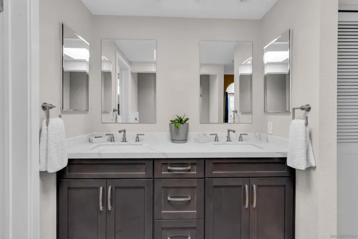 Stunningly updated Mission Hills townhome that offers a rare combination of modern upgrades, energy efficiency, and exceptional outdoor living. The home showcases dramatic vaulted ceilings, arched windows, and a flowing floor plan that connects the remodeled kitchen, dining area, and living room. The living room opens to a large, private terrace with sweeping views—an ideal setting for entertaining or relaxing. The primary suite is a true retreat with vaulted ceilings, a spa-inspired bathroom, and two private balconies that capture natural light and neighborhood charm. Upgrades include a remodeled kitchen with KitchenCraft cabinetry, Thermador appliances, and a gas stove, plus a luxurious primary bathroom with a freestanding tub, custom shower, and dual vanities. A deck conversion created a spacious walk-in closet, while another was reimagined as a private office with maple cabinetry. Energy efficiency is unmatched with fully owned solar installed in 2024—16 Panasonic panels with a 25-year warranty—keeping the average annual power bill around $600 while charging two electric cars and running A/C in the summer. The roof was replaced in 2021, and a rare two-car garage provides convenience and additional storage. The $525 monthly HOA covers water, trash, recycling, gardening, roof maintenance, high-speed internet, and exterior building upkeep. Perfectly located just minutes from downtown, the airport, Balboa Park, and Mission Hills’ charming shops and dining, this home blends sustainability, style, and an unbeatable location.