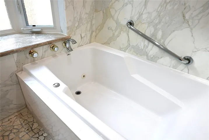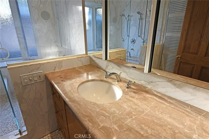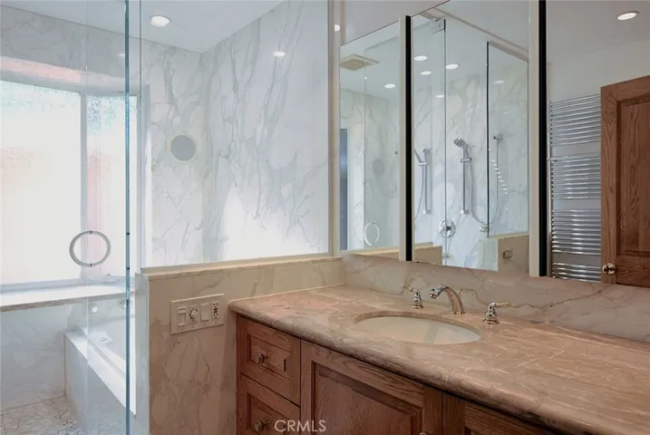 — At the end of the hall, a Japanese-style spa serves as the home’s centerpiece: steam system, karaoke audio, deep soaking tub, Calacatta Gold marble walls and baseboards, Breccia Onicata marble surfaces, Robern mirrored cabinets with a fog-free center mirror, and heated towel rack. The master suite features a private full bath with a Kohler Greek soaking tub, a granite countertop and baseboards, Grohe fixtures, a custom closet, and direct access to a secluded patio through a glass slider.