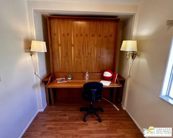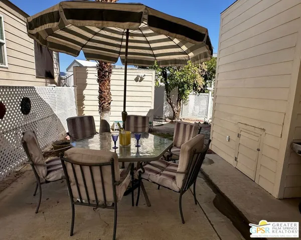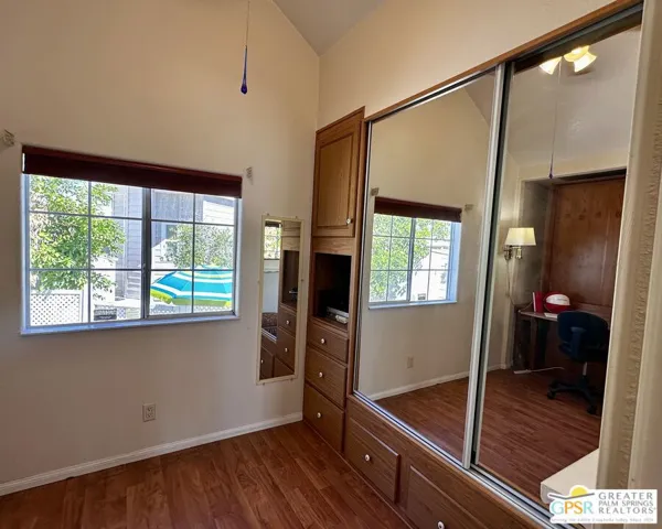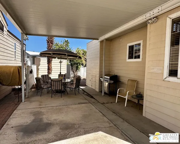 Welcome to Desert Shadows RV Resort Park! This furnished 2-bedroom, 1-bath turnkey mobile home offers comfort, space and convenience in a desirable Cathedral City location. Step inside to a spacious floor plan featuring raised ceilings in the living area, creating an open and airy feel. The galley kitchen comes fully equipped with an oven/range, refrigerator, dishwasher, microwave along with cooking and eating essentials. The living room with soaring ceilings opens directly to the kitchen and bedroom loft above for that perfect night’s sleep. The second bedroom, currently used as an office/storage area, includes a Murphy bed, desk and plenty of closet space. The bathroom showcases a round tempered glass vessel sink and shower. Outside features an entry deck for your morning coffee with stunning mountain views. The covered carport for one automobile also highlights a dining area right next to the outdoor grill and further back is a storage shed for keepsakes along with a citrus tree and another little patio area for sunbathing and hanging out. A laundry facility is conveniently located across the street. Each of the 460 individually owned HOA lots has a metered 50-amp electric service and includes water, sewer, trash/recycling, Spectrum cable and High-Speed Internet. The resort is a gated senior 55 plus community and includes a thriving pickleball community, tennis courts, 6 swimming pools including a large lap pool, a fully equipped fitness center, a world-class indoor shuffleboard pavilion, wood shop, two large clubhouses and so much more. Don’t miss this chance to own an affordable desert escape with unbeatable convenience! Call or text today for the lockbox combination. Lockbox located to the left of the front entry stairs on outdoor water faucet.