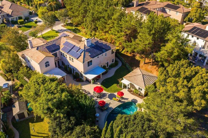 Welcome to 17117 Tallow Tree Lane — an exquisite estate nestled within the exclusive, gated enclave of Savenna, one of San Diego’s most coveted communities in the prestigious 92127 zip code. This engaging residence spans over 5500 square feet and includes a fully permitted guest house, offering a total of six bedrooms and six-and-a-half bathrooms—each space thoughtfully presented to balance comfort, privacy, and comfortable living. Perfectly positioned on a private cul-de-sac and set on a half-acre of manicured grounds, this property embodies Southern California luxury. The resort-style backyard features a sparkling pool and spa, built-in barbecue pavilion, and multiple outdoor lounging and dining areas—creating an ideal setting for both intimate gatherings and grand entertaining. Inside, refined updates and timeless elegance harmonize. The gourmet chef’s kitchen showcases Viking appliances, white cabinetry, quartz countertops, double ovens, and designer fixtures, along with a convenient bar area with wine refrigerator and sink for effortless hosting. Throughout the home, new carpet, refreshed wood flooring, and an abundance of natural light accentuate its warm and welcoming ambiance. A first-floor ensuite bedroom offers comfort for guests, complemented by a dedicated office, hobby area, and music room—spaces perfectly suited for creativity, productivity, or peaceful retreat. Upstairs, the main suite is a true sanctuary, featuring a fireplace, dual walk-in closets, a personal fitness room, and a newly remodeled spa-inspired bathroom. Three additional bedrooms—each with its own ensuite bath—ensure privacy and ease for family or guests. Additional living spaces include a tranquil library, an elegant formal dining room, and a spacious living room designed for gathering and connection. Modern convenience and sustainability are seamlessly integrated, with Tesla solar panels, two 75-gallon water heaters, a whole-home water softener, and an epoxy-coated four-car garage. The guest house extends the estate’s versatility with 441 square feet of private living space, a full bath, cooktop, and wood and tile flooring—perfect for extended family, visitors, or potential income use. Impeccably maintained and thoughtfully designed, this home offers a lifestyle defined by serenity, versatility, and style.