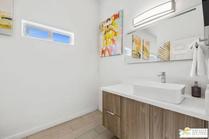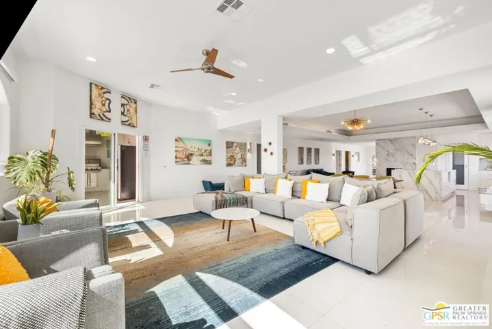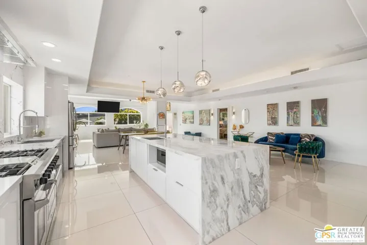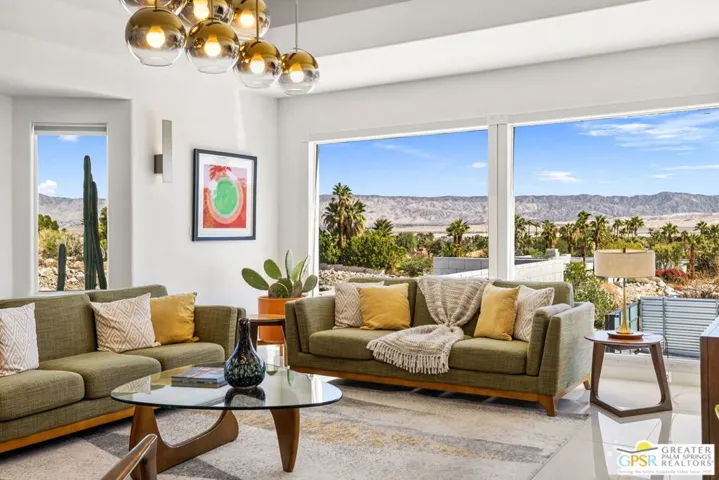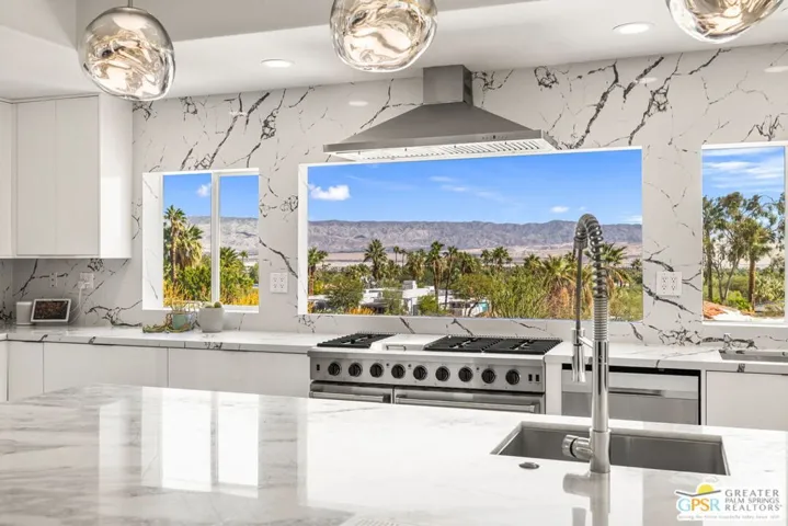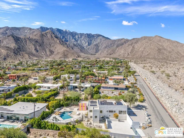 Palm Springs reveals its most striking perspective from this Chino Canyon perch, where the San Jacinto Mountains and open desert form a backdrop of pure drama. This exceptional property delivers a rare blend of privacy, scale, and style. The estate-sized lot of more than seventeen thousand square feet frames a beautifully reimagined residence where contemporary design meets effortless comfort. The interiors move gracefully between formal and informal living areas, anchored by a chef’s kitchen featuring a ten-foot marble island, professional-grade appliances, double ovens, and two dishwashers for effortless entertaining. Four ensuite bedrooms are positioned on two levels for ideal separation and flexibility. The primary suite includes a soaking tub and private washer and dryer, while the secondary suites open directly to the pool terrace. Outdoor living shines with a forty-three-foot saltwater pool with Baja shelf and spa, surrounded by multiple lounging areas, a fire feature, and a large grassy lawn. The outdoor kitchen with full refrigerator and dining area makes entertaining easy. Evenings are spectacular under custom lighting that highlights the desert landscape. Additional highlights include a second laundry area near the pool bath, an EV-ready garage within the gated motor court, rooftop solar in place, and turnkey furnishings. Take the Matterport Virtual Tour for a better sense of flow. The best of Uptown Palm Springs is a short hop away.