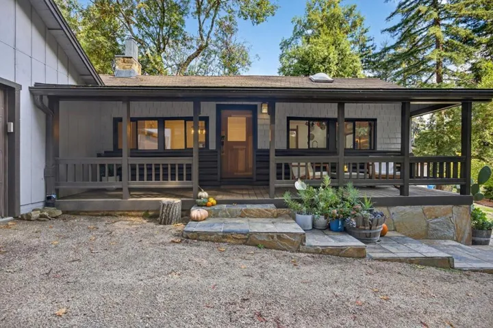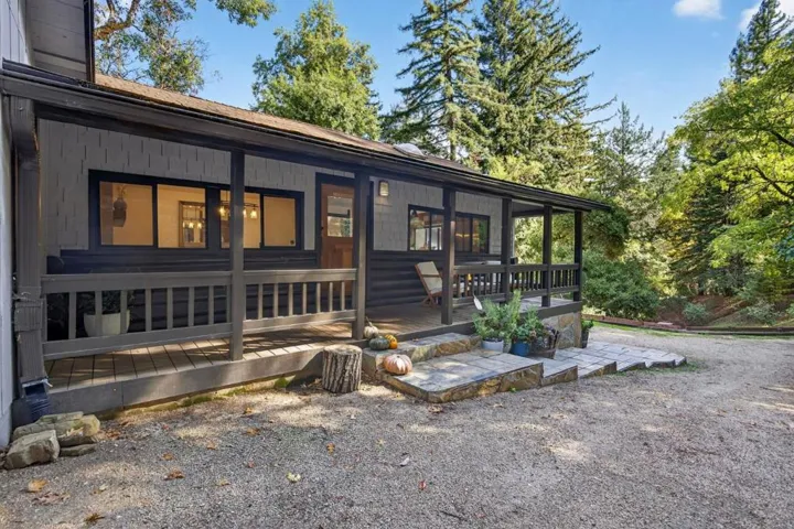 So much newness! Expanded from original cabin around 2008. Since 2021: New oak floors, new whole house generator, new steel ducting, much more. Charming 4 bd. 3.5 ba. home is modernized and part of Los Gatos history. Primary plus one more en-suite bdrm! Natural light fills the living areas including the kitchen where a large center island, gas stove, and lots of counter space make cooking a joy! The primary suite opens to the back deck with beautiful views and features a walk in closet and oversized tub for the ultimate relaxation. One additional en-suite room, plus 2 more bedrooms! An inviting living room with cozy Jotul gas stove opens to the back deck where the jacuzzi awaits. What is a mtn. home without a wood-beam ceiling wine cellar? Keep your collection cool in this fun space! Steps away, a separate stand alone office space, updated in 2024 and now complete with AC/Heat, recessed lighting, and more, perfect for work-from-home, she-or-he-shed or other! Frontier fiber ready, Starlink available. 3.5 ac. lot, some usable land! Fruit trees produce in abundance, chicken coop is ready for your chickens, sun and shade, this is a truly beautiful setting! It’s quick and easy to get onto Bear Creek Road and then you are just 8.7 miles into downtown Los Gatos. Los Gatos schools!