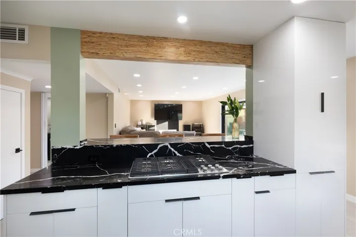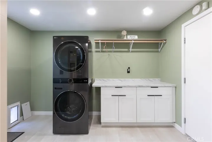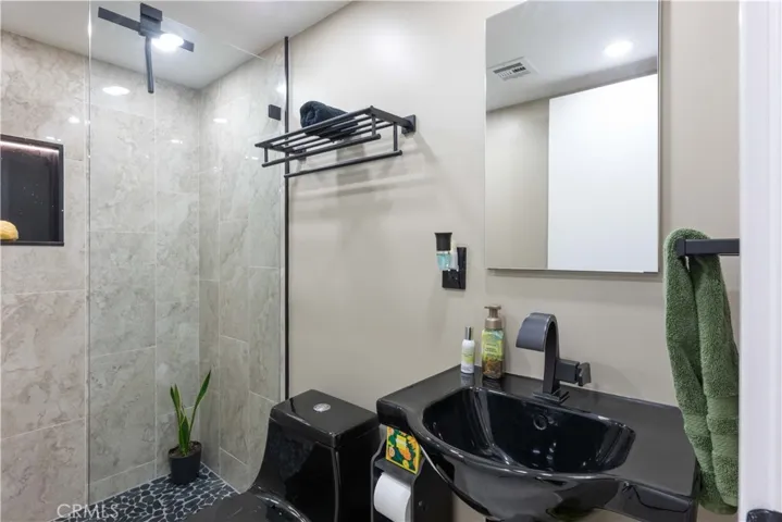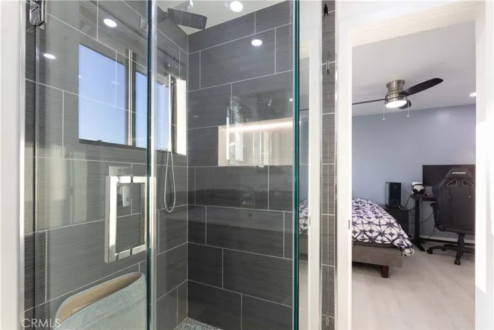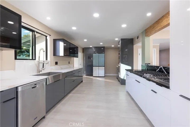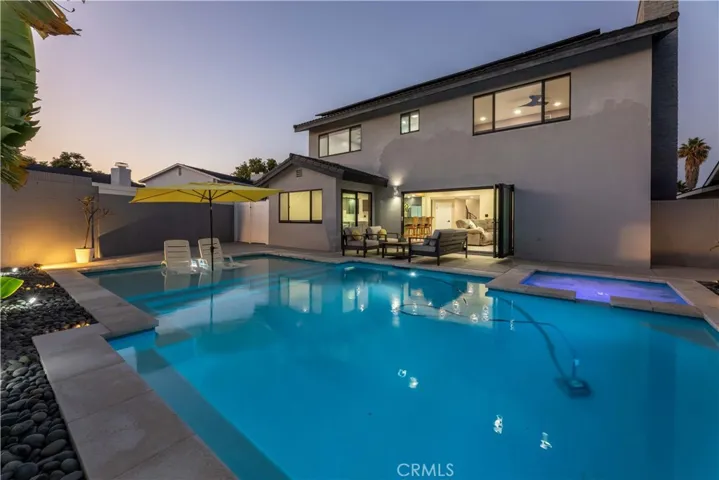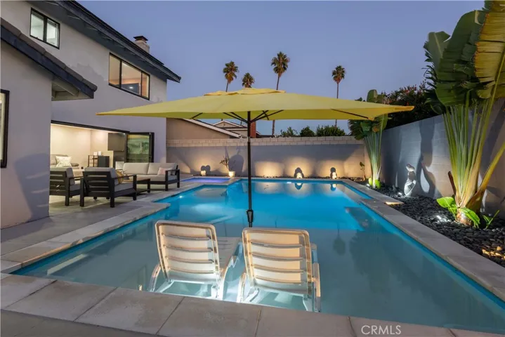 Experience luxury living in this fully renovated four-bedroom, four-bath modern home with mid-century accents in the highly sought-after El Dorado Park Estates neighborhood of Long Beach. Designed with a seamless open floor plan, this turnkey residence showcases high-end finishes, clean lines, and contemporary amenities throughout. The chef-inspired kitchen offers abundant storage, built-in appliances including a gas cooktop with downdraft ventilation, high-gloss self-closing cabinets, pullout drawers, and floating glass shelving—perfectly blending style and function. The living room features a sleek gas fireplace and a trifold glass stacking door that opens to the backyard, creating effortless indoor-outdoor living. The downstairs private suite includes a three-quarter bathroom, ideal for guests or multigenerational living. Upstairs, the grand primary suite is a true retreat with a gas fireplace, walk-in closet, private quarter bathroom, and a luxurious spa-style ensuite transformed from the home’s fifth bedroom. Enjoy dual floating sinks, a soaking tub, and an extended shower with multiple showerheads—all highlighted by custom marble, Bluetooth speakers, and designer lighting. The upstairs also includes a full bathroom with floating cabinets, and one bedroom with a private three-quarter ensuite for additional comfort. The entertainer’s backyard is a true oasis featuring a heated saltwater pool with Baja shelf and spa, custom lighting, a tranquil koi pond, synthetic low-maintenance turf, gated RV parking, and a large custom-built shed. Additional highlights include a spacious attic with dropdown ladder, paid-off solar, and proximity to Newcomb Academy (K–8), parks, restaurants, and freeway access. Every detail has been curated for a lifestyle of modern sophistication, mid-century charm, and effortless living. Close to the 605, 5 and freeways and centrally located between Los Angeles and Orange Counties.