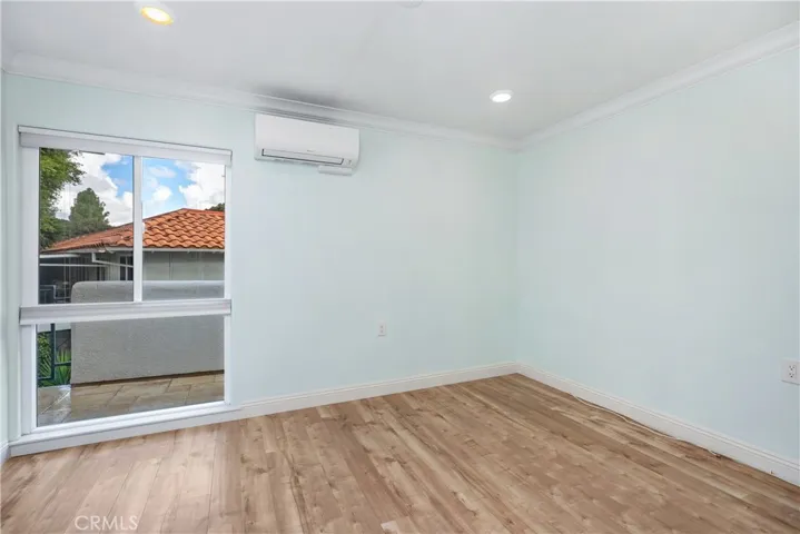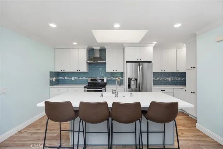A Little Slice of Paradise! This open-concept, fully remodeled, end-unit “MONTEREY” model single-level has NO STAIRS, with no one above and one unit below, features an added primary bath. A beautiful home, newly painted, which is full of natural light and truly one-of-a-kind. Gourmet, island kitchen with quartz countertops; tiled glass backsplash; stainless steel appliances; generous white wood cabinets with soft-close doors & drawers; and added recessed lighting. In addition, Skylights in the kitchen, living room, and hallway, along with solar tubes in each bathroom, make the unit light and bright. This is thanks to the floor-to-ceiling windows in the living room and bedrooms—a versatile split floorplan with bedrooms on opposite sides. The primary bedroom mirrored closet was remodeled to add more storage space. Both bathrooms feature white wood cabinets, modern quartz countertops, walk-in tiled showers with glass enclosures, and added solar tubes for natural light. The primary bathroom has double sinks & mirrored medicine cabinets, laminate wood-look flooring throughout the living spaces, and porcelain tiles in the bathrooms. The comfortable living room is accented by a custom electric fireplace with tile surround, floor-to-ceiling windows, and two added skylights. Many premium upgrades throughout, including double-pane vinyl windows, custom window coverings, new energy-efficient ductless mini-split heating/air units, custom extra-wide baseboards & crown molding, an upgraded front door & paneled interior doors with custom casings, a retractable front door screen, and added recessed lighting. Inside laundry…a full-sized LG washer & dryer are included—spacious private, partially covered patio with imported travertine stone.