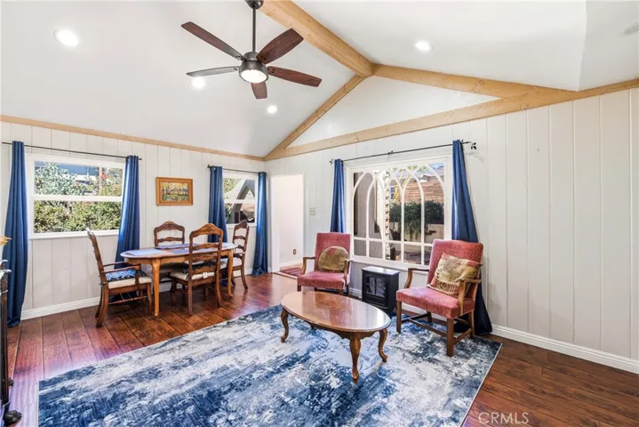 Welcome to your mountain retreat in Chatsworth Lake Manor! This delightful two-bedroom, one-bath home offers over 1,300 square feet of living space, blending modern updates with rustic charm. The spacious living room features beautiful wood floors throughout, a ceiling fan, exposed wood beamed ceilings, and a cozy electric fireplace perfect for chilly evenings. The updated kitchen boasts granite countertops, newer stainless steel appliances including a microwave, oak cabinetry, a tiled backsplash, and a breakfast bar. Step outside to the oversized balcony with stunning mountain views, and enjoy the large backyard—ideal for entertaining or gardening under the shade of a mature oak tree. Perfectly located for outdoor enthusiasts, this home provides a peaceful atmosphere while remaining close to local amenities.