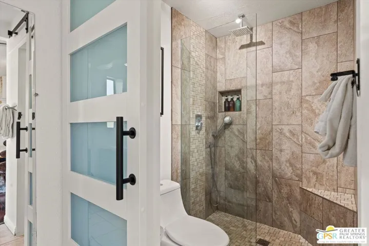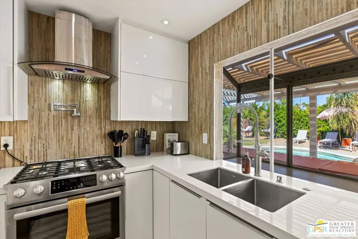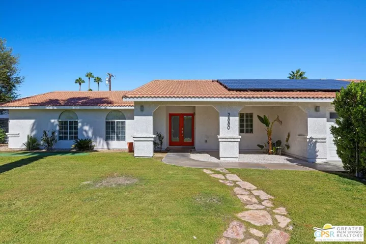 Maximalist Palm Springs Vibes! Offered turnkey furnished, this spacious ranch home has received a glow up to infuse a chill resort style inside and out. Featured in an episode of Staycation on CBS, the designers have created an instagram-worthy home that has operated as a successful vacation rental for several years. Set behind a ficus hedge, the home maximizes recreational use front and back. Interiors are dramatic and include a renovated kitchen with Bosch appliances, soft-close cabinetry, and a striking custom Italian granite slab center island. The dining area includes a service bar with ice maker and beverage cooler. The living area is anchored by custom wall treatments and a gas fireplace. There are three uniquely appointed bedrooms and two bathrooms in the main home, including the resort-size primary which boasts a spacious spa-inspired bathing area, and the suite has French doors opening to the backyard. Rare in this neighborhood, the home has an attached casita with separate entrance, spacious bedroom, generous bath with soaking tub, and a kitchenette with a roll-up window that creates a service bar for the leisure area – perfect for pool party season! Offering a roster of additional service amenities like owned solar, free-form saltwater pool, putting green, hot tub, firepit, BBQ, pizza oven and a 2-car garage currently used as a game room, there’s no reason for guests to leave! As of 10.16.2025, there are currently two wait-listed STVR applications for the Gene Autry neighborhood, so realizing this as an investment property can begin immediately with a junior certificate while waiting for a general license. (Buyer to confirm and investigate all details of rental process.)