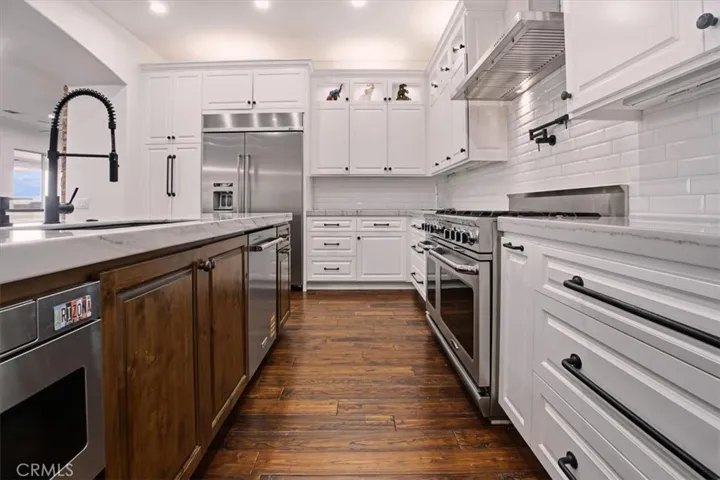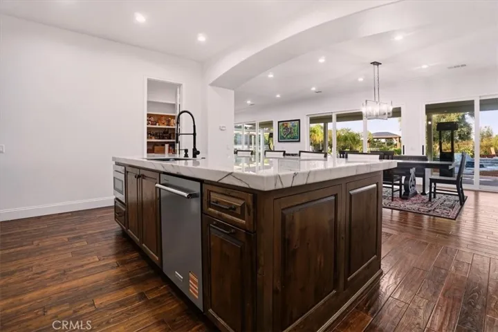 Inside, rich hardwood floors and a wood-burning stone fireplace create warmth and sophistication. The open-concept floor plan flows seamlessly between the living room, family room, and dining areas, including a flexible space for formal dining or office use. The chef’s kitchen is a showpiece with marble countertops, white cabinetry, designer tile, large island, and professional-grade 8-burner range with pot filler.