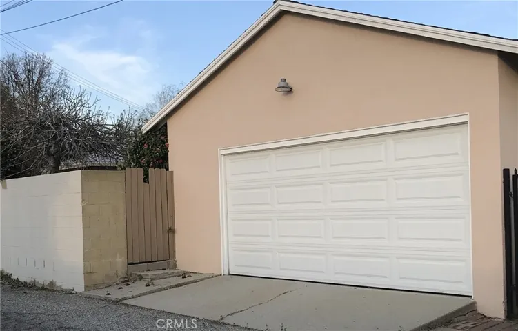 2 car garage with alley access and entrance to view the private back yard with gorgeous flowers and fruit tree including a quaint patio area.
