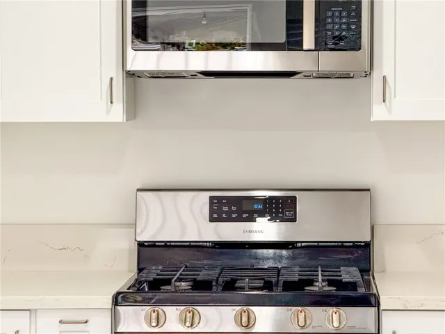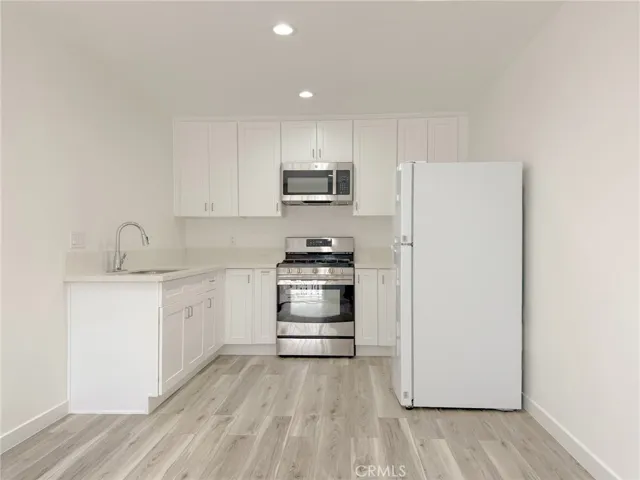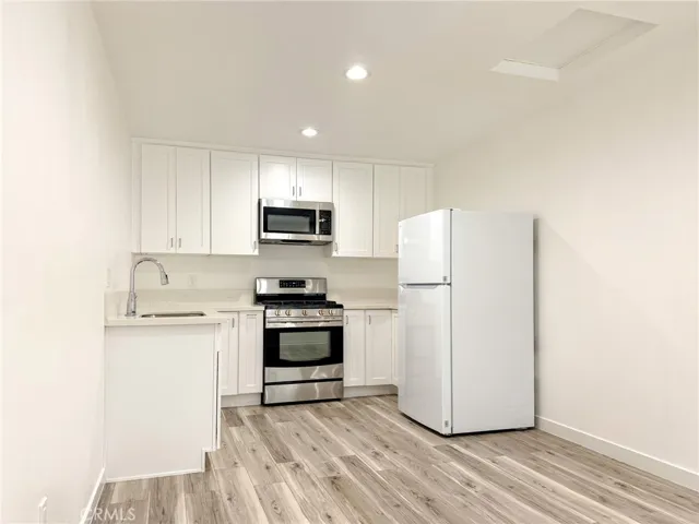 The kitchen boasts shaker-style cabinets, quartz countertops, and stainless steel appliances, including a gas range, microwave, and refrigerator. Recessed lighting and luxury vinyl plank flooring flow seamlessly from the kitchen into the living area, creating a clean, spacious feel.