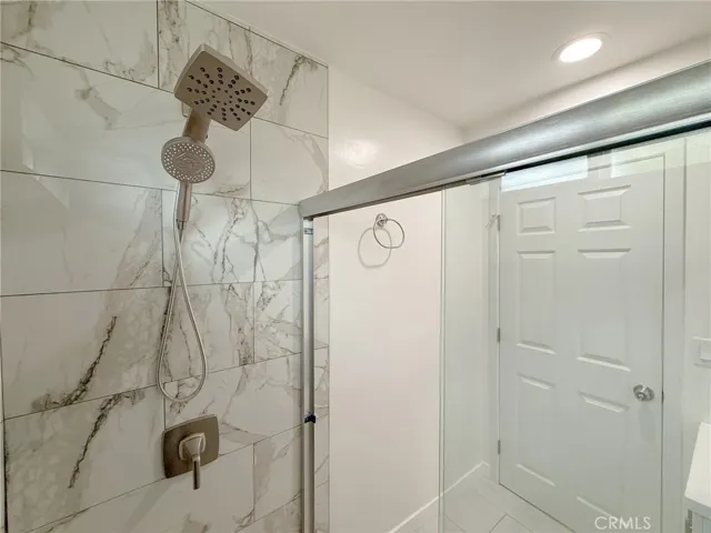 The bedroom offers ample natural light and closet space, while the stylish bathroom showcases floor-to-ceiling marble-style tile, a glass-enclosed shower, and modern fixtures. Enjoy your own private fenced patio area, perfect for outdoor relaxation or entertaining.