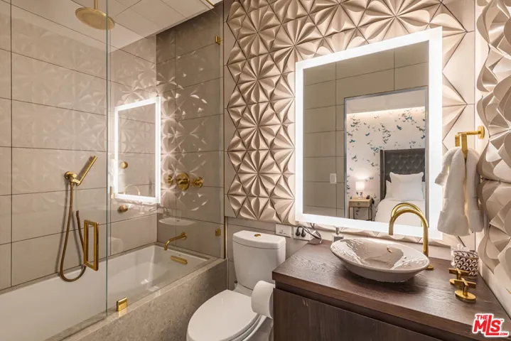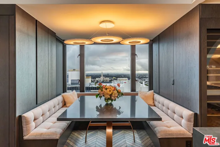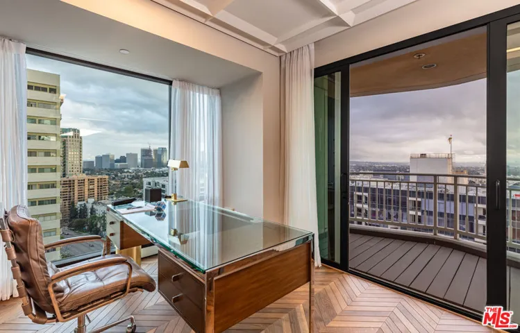 Turnkey Designer Furnished Condominium. Nestled within the distinguished Remington Private Residence Tower in Westwood and following a three-year gut renovation, this exquisitely designed 3/4 bedroom, 3.5 bathroom condominium is a masterclass in modern luxury and timeless sophistication in pristine move-in condition. Complete furnishings available for purchase, including custom-made furniture, designer lighting and chandeliers, custom rugs, Frette linens, comprehensive AV system, window coverings, extensive kitchen cookware, appliances and flatware. Encompassing 3,283 square feet, the home welcomes you from your Private Elevator directly into your gracious formal foyer, unfolding into a sun-drenched, open-concept living space framed by floor-to-ceiling windows and an extensive terrace that captures breathtaking panoramas of the city skyline. The interiors unfold with an artful balance of drama and refinement. Rich chevron-patterned hardwood floors and custom coffered ceilings guide you to the striking black marble gourmet kitchen, where bold design meets everyday functionality. State-of-the-art Miele appliances, a walk-in pantry, and a custom breakfast nook create an inviting space that transitions effortlessly from quiet morning rituals to vibrant gatherings. The adjacent office/den/4th bedroom outfitted with bespoke cabinetry and sliding glass doors, doubles as a versatile sanctuary with access to a private terrace. A dedicated laundry room and extensive storage add convenience. A marble-clad hallway leads to a serene guest suite, designed with privacy and comfort in mind. On the opposite wing, the primary suite defines luxury living. An entryway lined with mirrored panels sets the tone, while recessed and paneled custom ceilings and expansive windows frame the glittering cityscape. The suite extends to a private terrace, a tranquil haven from which to savor the views. The ensuite bathroom is a spa-like retreat, featuring a stone-clad walk-in shower, a deep soaking tub, a private infrared sauna, and a custom dressing room that rivals the most elegant ateliers. An additional ensuite guest suite and formal powder room complete the home. Throughout, thoughtful design details -architectural arches, custom contemporary finishes, and discreet hidden storage – imbue the residence with an air of bespoke sophistication, where every inch has been meticulously curated. Modern conveniences such as a Crestron smart-home system, automated shades, and custom lighting ensure effortless living, seamlessly blending luxury and technology. As part of the two dedicated parking spaces, a coveted submeter purchased for a private EV charger. Additional separate storage room and wine locker are included. More than a residence, this exceptional offering sets a new standard for vertical living in Los Angeles’ most coveted address- a harmonious fusion of artistry, design, and comfort. Residents of The Remington enjoy unparalleled amenities synonymous with elevated living: 24-hour valet parking, a stately library and fireside lounge, a grand banquet hall, an outdoor pool, a state-of-the-art fitness center, and expansive alfresco dining areas complete with a cozy outdoor fireplace.
