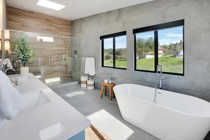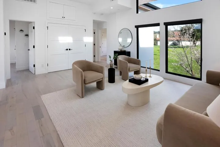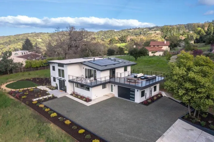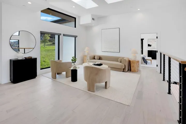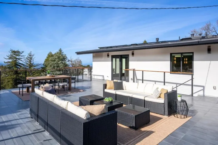 Come right in. Enjoy the view. This stunning remodel completed in 2025 offers space, views, and peace of mind. With completely new high-end finishes throughout, this Mid-Century Modern masterpiece sits atop a private, lush acre, seamlessly blending modern luxury with nature’s tranquility. Designed for those who appreciate both serenity and grand entertaining, a true retreat where hawks glide above. The expansive open-concept living space flows into a gourmet kitchen, featuring Bertazzoni five-burner gas stove, refrigerator and dishwasher plus gorgeous brass fixtures. Floor-to-ceiling windows showcase panoramic views of rolling hills & twinkling city lights, creating an awe-inspiring backdrop. A grand two-story entryway leads to an elegant dining area, warmed by a glass-enclosed gas fireplace. Step onto the rooftop deck, where alfresco dining meets unparalleled stargazing & sunset views. The primary suite is a private sanctuary, complete with a spa-like soaking tub and a bed perfectly positioned for breathtaking sunset views. Four additional bedrooms offer luxury & privacy for all, each has its own full bath. This is more than a home. It’s an experience of modern elegance, timeless design, & natures embrace.
