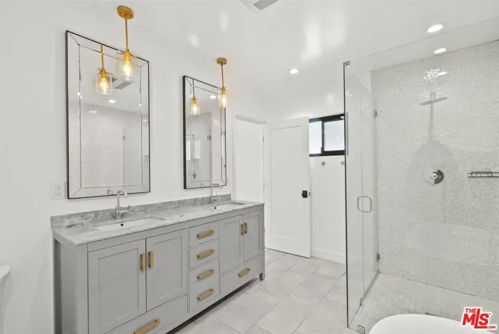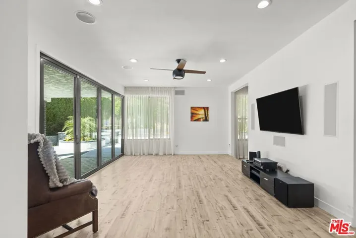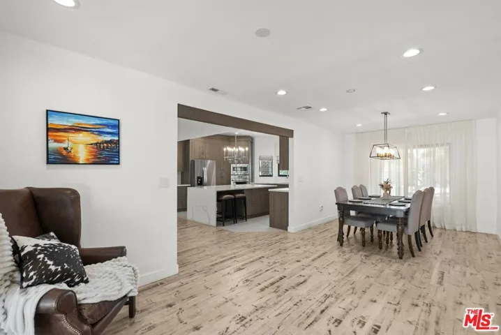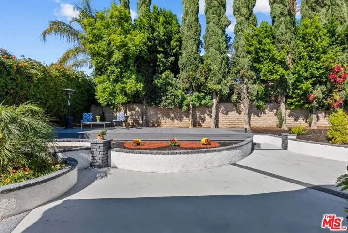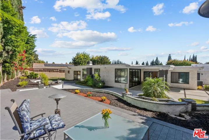 Step inside this elegant single-story home in Northridge’s coveted Devonshire Highlands, where modern design meets timeless comfort. Spanning nearly 2,800 sq ft on an almost 13,000 sq ft lot, this 4-bedroom, 4-bath retreat welcomes you with an airy open layout, high ceilings, and abundant natural light from modern sliding doors that frame the lush greenery outside. The formal entry leads to a sophisticated living room with a striking marble-and-wood fireplace and calming neutral tones. The chef’s kitchen is the heart of the home, showcasing an enormous center island, quartz countertops, custom cabinetry, and stainless steel appliances, flowing seamlessly into the family room with accordion glass doors that open to the backyard for effortless indoor-outdoor living.The dining area offers elegance with a modern chandelier and large sliding doors, ideal for family gatherings or entertaining guests. The primary suite is a private retreat featuring a spa-inspired bath, soaking tub, and a spacious walk-in closet. Nearly every bedroom includes its own walk-in closet, ensuring comfort and functionality throughout. Additional highlights include recessed smart lighting, newer windows, modern bathrooms, a 3-car garage, a huge backyard with mature trees that enhance both privacy and beauty. A covered patio outdoor with spacious deck, and newly refreshed landscaping make this home perfect for relaxation or entertaining. With designer finishes, modern upgrades, and a cul-de-sac location near top-rated schools, shops, and dining, this home captures the essence of modern California living.
