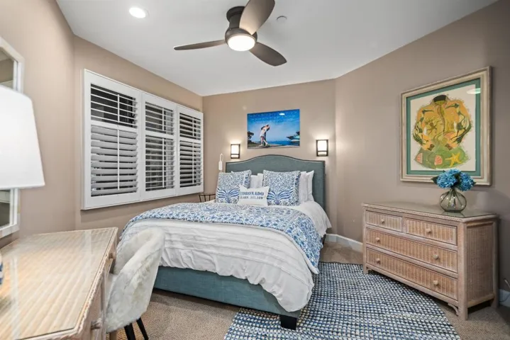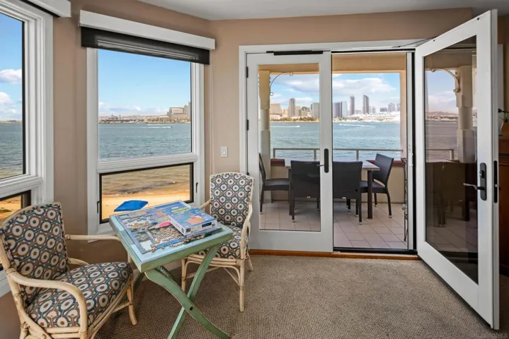 INCREDIABLE BAY AND CITY VIEWS – AVAILABLE EITHER LONG-TERM OR SHORT TERM FURNISHED. This extraordinarily beautiful corner unit condo with spectacular views of San Diego Bay and Downtown is fully furnished and ready for guests. Located in “The Landing,” you have access to a pool, spa, BBQs and gym and you are within walking distance to the Ferry Landing, restaurants, bike path around the bay, shopping, and all Coronado points of interest and festive locations! The unit is well appointed and spacious enough for 2 couples or a family of 4 to spread out and relax and take in all the beauty that Coronado/San Diego Bay has to offer, from Navy ships cruising by, to fireworks and music from the Rady Shell in the evenings. The primary bedroom with king-size bed is complete with en suite bathroom and is located in the front of the unit facing the water and has unobstructed views of the bay and skyline. There’s also a French door leading out to a sitting deck that allows for morning coffee or a glass of wine at sunset. The living/dining area also enjoys the same views along with access to the sitting deck. Bedroom 2, also en suite bath, has a queen size bed and is located near the entry of the unit. There is one covered parking spot included, AC and full-size washer and dryer inside unit. Fireplaces located in Living room and Primary Suite Beach chairs provided. You will love this location and want to return each year. Rates vary based on season and length of rental. September 2025 – May 2026 – $8,500 June/August 2026- $12,500 July 2026- $18,000