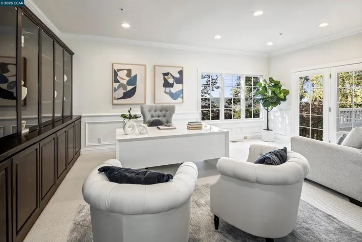 Perched atop the Orinda Oaks Open Space Preserve, this estate offers sweeping views of Mt. Diablo and the Berkeley hills. Mature oaks, Japanese maples, wisteria, lavender, roses, and other lush foliage flank the home. Step inside the foyer beneath 15-foot ceilings. To the left, a 360-sq-ft living room sits under a coffered ceiling; to the right, the dining room accommodates 10-12 with garden views. The kitchen features a large island with bar seating, a breakfast nook nestled into a bay window, 2 ovens, 2 sinks, 2 dishwashers, and ample counter space. Adjoining the kitchen, the family room spans more than 360 sq ft and includes a full wet bar. A 240-sq-ft office and large wraparound patio offer inspiring views—including glimpses of SF Bay. Four bedrooms are on the lower level, including a private guest/in-law suite or exercise room. The 460-sq-ft principal suite upstairs offers a marble fireplace, 2 walk-in closets, a nursery or exercise room, and a luxurious bath with steam shower, jacuzzi tub, sauna, dual vanities, and skylights. Outdoor living is equally distinguished with a covered swimming pool, built-in grill, and pergola-shaded lounge area with a new gas firepit overlooking the Preserve’s natural splendor.