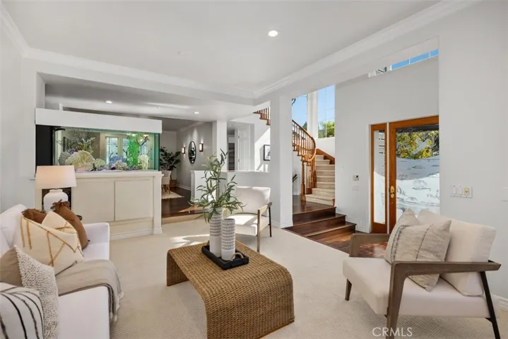 A bright and welcoming entry showcases 3 large front windows and a graceful curved staircase, setting an elegant tone from the moment you arrive. The formal living room features a handsome paneled fireplace and a stunning built-in 200-gallon salt water aquarium, complete with high-end filtration system. This creates a one-of-a-kind focal point that brings life and calm to the space. Just beyond is the large formal dining room offering the perfect backdrop for holidays and gatherings. A main level office or bedroom with a full bath provides flexibility for guests or a private workspace.