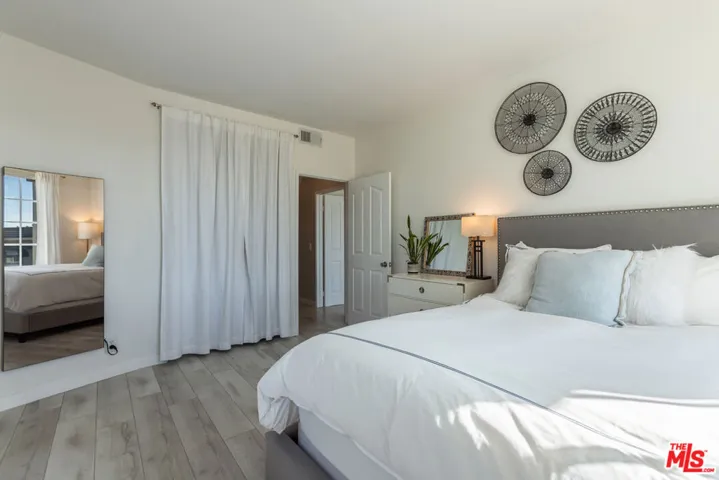 The one you have been waiting for. California casual sophistication defines this highly desired corner residence, showcasing gleaming plank flooring throughout, soaring ceilings, recessed lighting, and an abundance of natural light. Enter through the inviting foyer into the dedicated dining area, highlighted by an impressive tray ceiling and custom light fixture, which flows seamlessly into the expansive main living space. Here, an elegant marble fireplace with wood mantle, convenient wet bar with shelving, and dramatic floor-to-ceiling glass doors open to a collection of intimate balconies perfectly merging indoor and outdoor living. The well-appointed kitchen boasts considerable cabinetry, stainless steel appliances, and a wine refrigerator, while a chic powder room completes the main level. Upstairs, the serene primary suite offers a spacious bedroom, stylish closet, and dazzling ensuite bath with dual vanity, deep soaking tub, and separate shower. A comfortable sunlit second bedroom provides ample storage, while the third bedroom offers flexible potential as an office, den, or guest space. Both are serviced by a sizable hall bathroom with sleek vanity and tub-shower combination. A dedicated laundry room with full-size side-by-side washer and dryer, upper cabinetry, and additional hallway linen storage complete the second level. Perfectly situated near the Miracle Mile, LACMA, The Grove, Century City, Beverly Hills, and more, this residence places renowned dining, shopping, and entertainment right at your doorstep.
