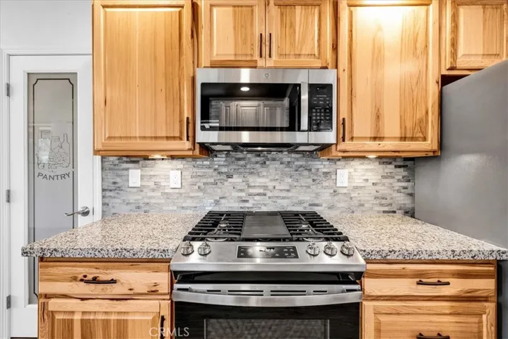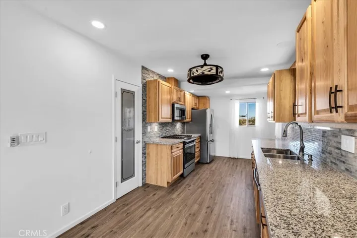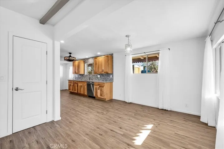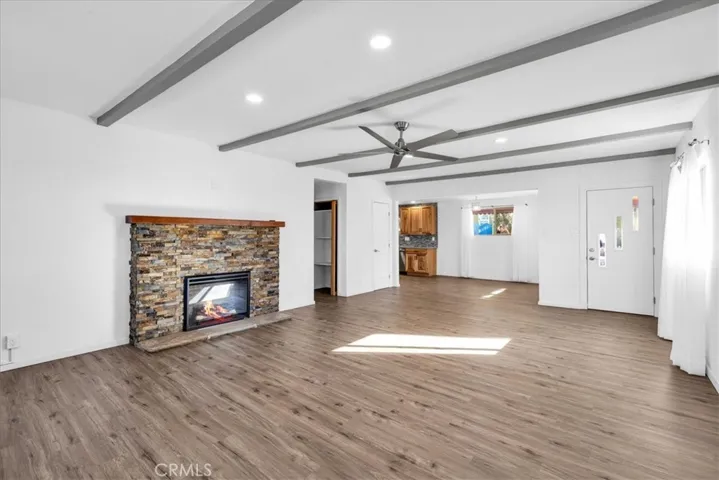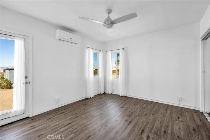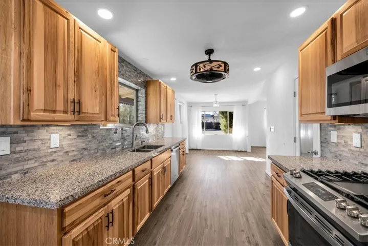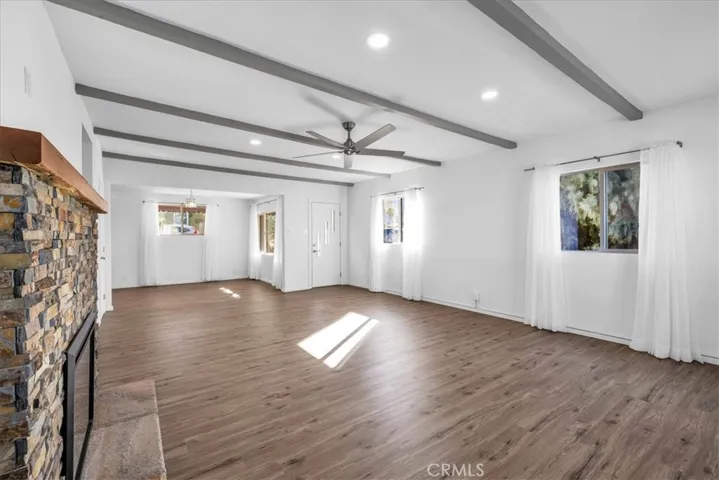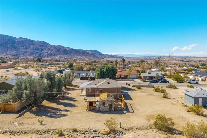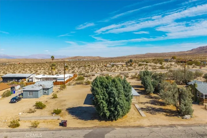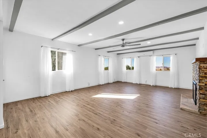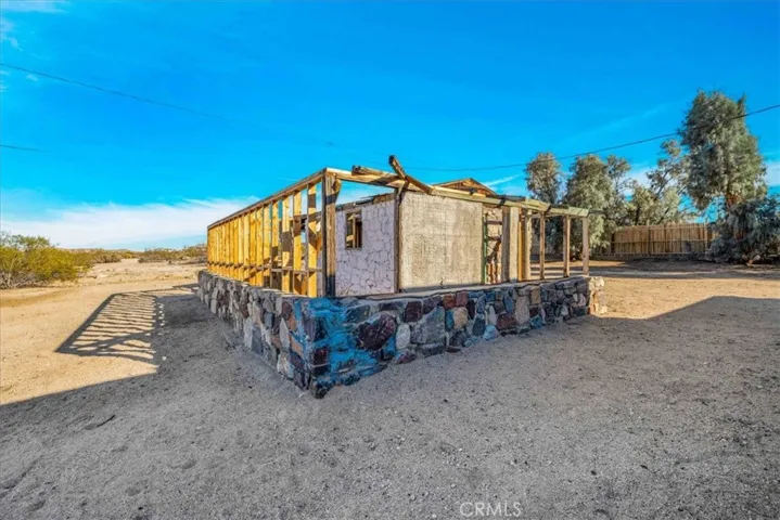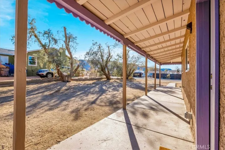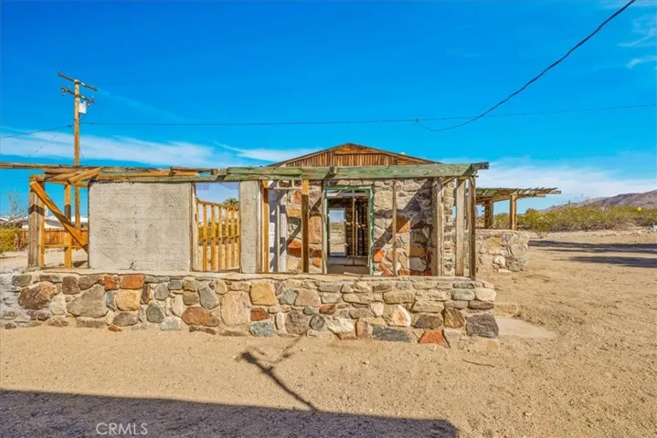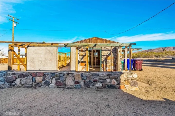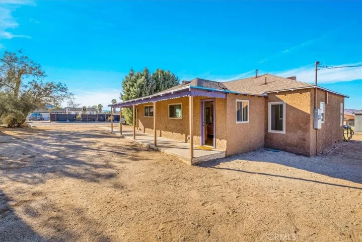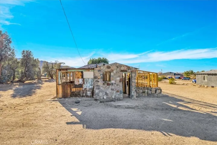Great home in the desirable Hanson area of 29 Palms, just minutes from the entrance to Joshua Tree National Park. This 3 bedroom, 1 bath house is being sold together with the neighboring parcel (APN 0590-222-04-0000), offering over one-third of an acre of combined land—plenty of room to expand or enjoy extra privacy. The home features a huge living area with beamed ceilings, large windows that let in abundant natural light, and a rustic stone hearth fireplace as the centerpiece. The kitchen offers plenty of beautiful new hickory wood cabinetry, granite countertops with a full tile backsplash, and stainless steel appliances including a gas range. Each of the three bedrooms is bright and comfortable, with ample closet space and individual mini-split units for zoned climate control. The hallway includes built-in storage and a convenient alcove with a stacked washer and dryer. You’ll also be pleased to know the home has a new roof. Outside, you’ll find extensive covered patio space perfect for outdoor living, as well as a historic stone outbuilding that may have served as the original homestead—a unique feature that adds to the property’s charm and character. With its spacious layout, dual parcels, and unbeatable proximity to Joshua Tree National Park, this property offers a rare blend of potential, history, and desert appeal.