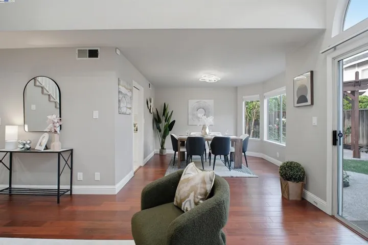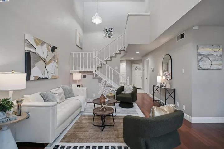 Welcome to this bright and spacious home with a west-facing entry door, ideally situated along the scenic Iron Horse Trail in the desirable New Castle community of San Ramon. This beautifully updated 3-bedroom, 2.5-bath residence features soaring vaulted ceilings, recessed lighting, new chandeliers in the dining area and kitchen, and a cozy fireplace in the living room. New carpet has been installed on the stairs, enhancing the home’s fresh and inviting feel. The modern kitchen is equipped with a new dishwasher, refrigerator, and microwave. The primary suite offers both a walk-in closet and an additional closet, providing ample storage space. Step outside to a charming backyard with a pergola, perfect for relaxing or entertaining, surrounded by multiple fruit trees. You’ll also love the spacious side yard and beautifully maintained front yard, adding to the home’s curb appeal and outdoor enjoyment. Located within walking distance to top-rated schools, City Center, Central Park, and Bishop Ranch, this move-in-ready home offers the perfect blend of comfort, convenience, and charm — with access to an HOA pool and nearby playground.
