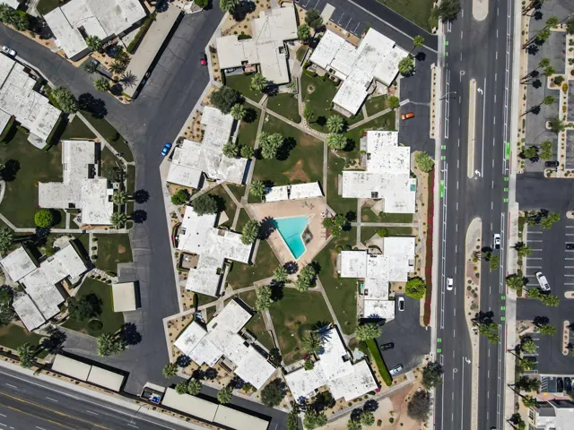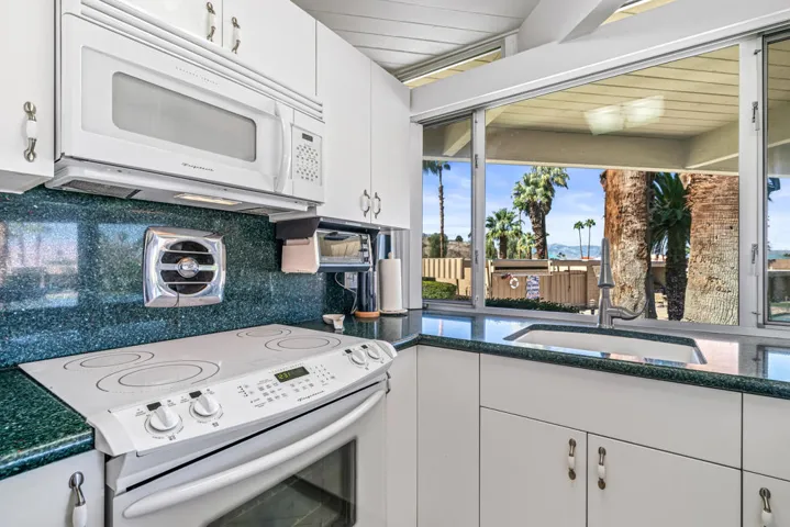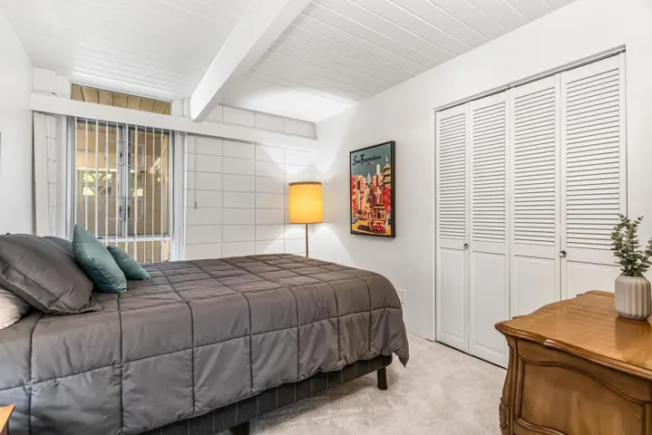 Mid-Century Sandpiper Gem! Step into the timeless allure of this classic Wm. Krisel-designed Sandpiper condo — one of the original mid-century units that beautifully blends iconic architectural details with thoughtful updates. Signature exposed concrete block walls, tongue-and-groove ceilings, and walls of glass capture the essence of true desert modernism.This 2-bedroom, 2-bath home features tile flooring throughout the main living areas and carpeting in both bedrooms. The open-concept living and dining space is anchored by an updated kitchen with sleek cabinetry, laminate countertops, and modern appliances.Enjoy dual-paned poolside sliders that open to a spacious patio overlooking lush greenbelt views, the sparkling pool, and the northern mountain backdrop. The private patio off the primary suite offers a quiet retreat and includes convenient outdoor laundry.Both bathrooms maintain their mid-century character while incorporating updated vanities and fixtures.Located in one of Palm Desert’s most desirable and historically designated sections of Sandpiper, this home is eligible for the Mills Act, offering potential property tax savings. Just minutes from the shops and restaurants of El Paseo, this mid-century treasure is ready to become your next desert retreat.