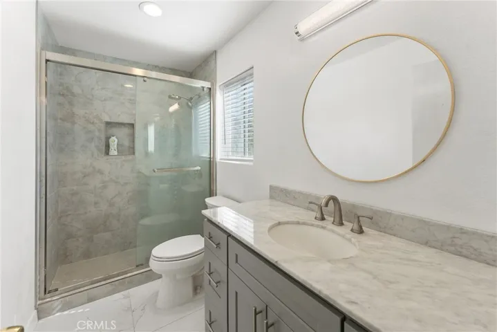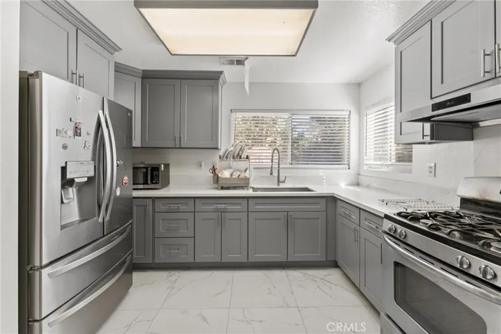 Step inside to an inviting living room with soaring high ceilings and laminate wood flooring, filling the space with warmth and natural light. The newly remodeled kitchen features quartz countertops, stylish cabinetry, and a functional open layout that’s perfect for everyday living and entertaining.