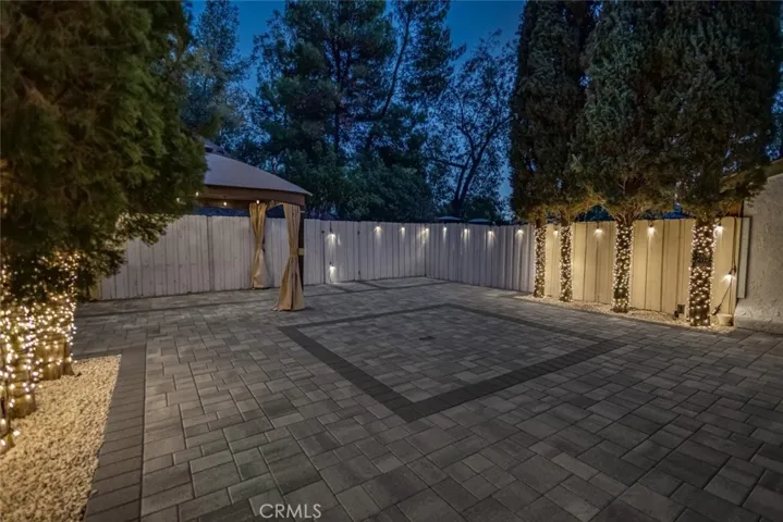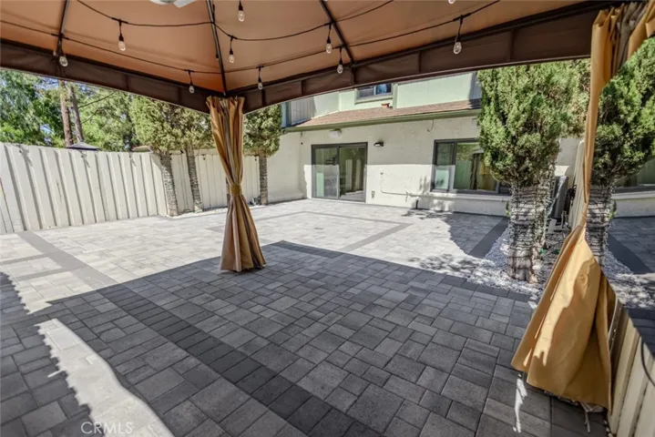 Enjoy relaxing or entertaining on the spacious patio featuring a gazebo with fan, heater, TV, outdoor speakers, and lighting for year round enjoyment. Inside, the 3 bedroom, 2.5 bathroom layout offers an inviting living room that flows seamlessly into the dining area and fully remodeled kitchen. Upgrades include recessed lighting, an electric fireplace, smart home features, quartz countertops, newer cabinets, energy efficient appliances, a stylish range hood, touch faucet, and reverse osmosis filtration. The bedrooms feature vaulted ceilings, while the bathrooms showcase Porcelanosa tile, Toto toilets, Hansgrohe fixtures, a luxurious primary shower, and a deep soaking tub. Solid core doors, dual pane windows, and newer AC and furnace systems ensure year round comfort and peace.