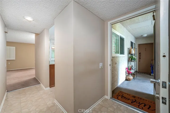 Welcome to this bright and inviting Villa Nueva model nestled in the desirable 55+ community of Laguna Woods Village. This spacious top-floor condominium offers serene treetop views and a comfortable floor plan designed for relaxed Southern California living. Entering the home, you’re greeted by durable tile-style flooring that flows into the kitchen and hallway. The kitchen features warm natural wood cabinetry, solid-surface countertops, and a full suite of appliances including a stainless-steel refrigerator, dishwasher, and sink paired with an all-white electric range and built-in microwave. A cozy breakfast bar offers additional seating and storage, while a window with plantation shutters fills the kitchen with natural light.