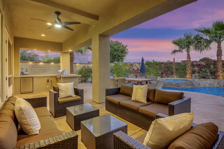 Welcome to Montage at Santa Rosa Coachella Festival Fans Favorite Resort Style place to be! Historical and forward performing luxury short term rental (STR) investment opportunity in this fabulous fully furnished remodeled Tuscan Style home featuring 5 spacious bedrooms, 3 baths. Multiple indoor & outdoor entertainment features = Relaxation & Fun! Open spacious gourmet kitchen boasts top of the line SS Appliances- built in cabinets, Calcutta marble waterfall countertop island w/ casual sit down & bar top seating, separate mini bar, fireplace Lg screen TV perfect for cooking while entertaining with friends & family! Step outside to your full-on private resort, flowing Palm Trees, Lg freeform saltwater pebble tec Pool & Spa, misting system, spacious patio deck, multiple lounge areas for tanning & dining options, cocktails at the spacious BBQ island or cozy firepit. Putting green, cornhole, bocce ball or move the party indoors to the tricked out Amazing Arcade Game Room w/ multiple full size Arcade games, Air Hockey, Pool Table, Foosball & more!Multiple options indoor and out, accommodating your entire group of friends & family with ample parking, walking distance to Coachella / Stagecoach, Polo & plenty of Golf, Dining and Shopping! Welcome to your private STR Resort!