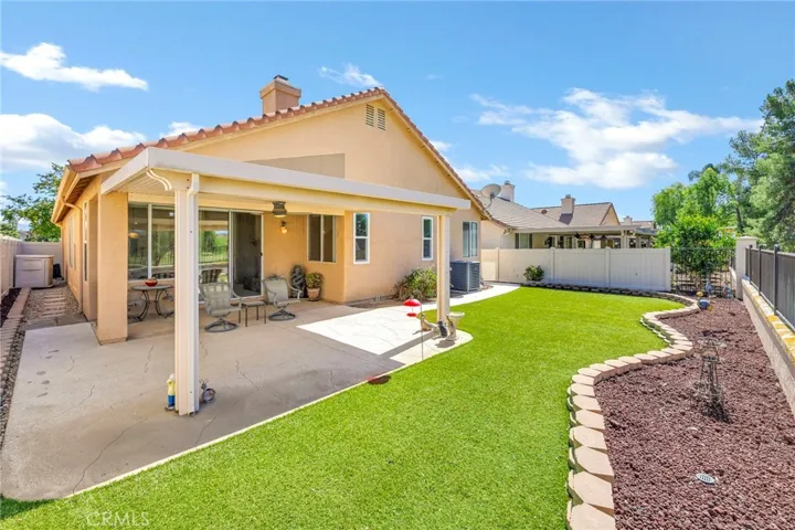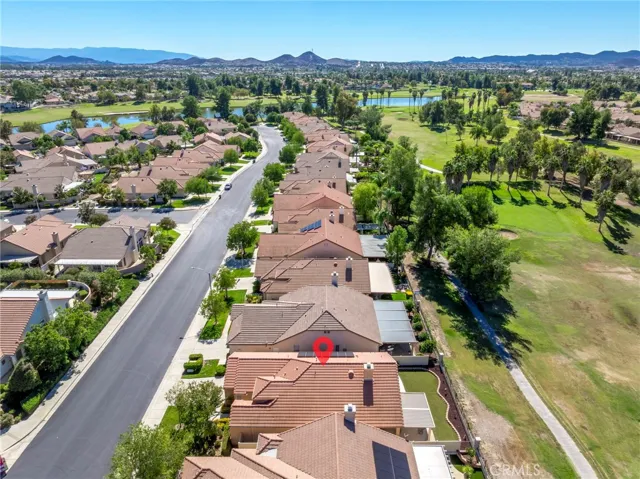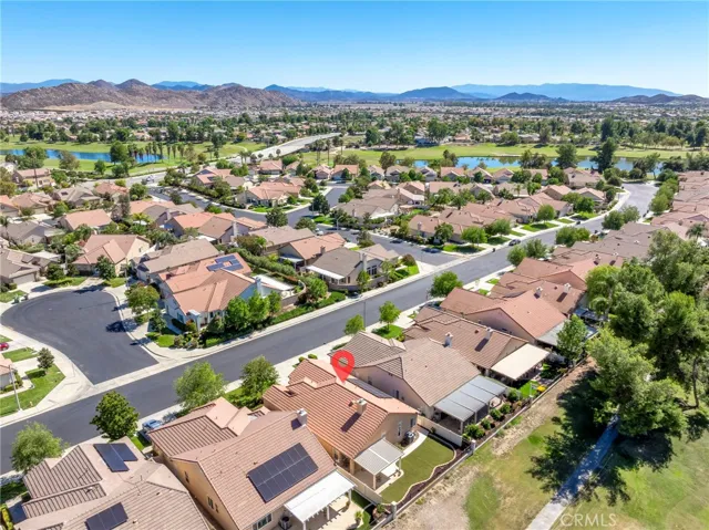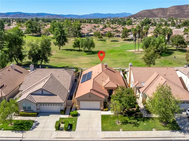 This beautifully maintained single-story home is located directly on the Golf Course in the highly sought-after 55+ Resort-Style Community known as “The Oasis”. This all-electric, energy-efficient residence combines comfort and functionality with an owned solar system, newer air conditioning installed in 2018, and a Quiet-Cool whole-house fan for maximum energy efficiency. Inside, you’ll find tall ceilings, crown molding, sun-screens, and ceiling fans throughout, creating a bright and comfortable living space. The open-concept layout features a spacious Great Room with a tile fireplace and built-in office area, ideal for working from home or managing hobbies. The Home Office could also be used as a 3rd Bedroom if needed. The eat-in kitchen offers ample cabinetry, generous counter space, and an inviting casual dining area perfect for everyday meals. The Master Bedroom suite provides a peaceful retreat with a large walk-in closet and an upgraded walk-in soaking tub installed in December 2023. The laundry room includes tile flooring, a utility sink, and extra storage. Step outside to enjoy low-maintenance landscaping with artificial turf, stamped concrete, and an alumawood patio cover with ceiling fan, overlooking the lush golf course with gorgeous mountain views. Additional highlights include an insulated garage door with built-in cabinets, a water softener, and a water heater blanket. The Guard-Gated community of Oasis offers resort-style amenities including a 22,000 sq. ft. clubhouse, pool, spa, fitness center, pickleball courts, bocce ball and a full schedule of social events and activities! The monthly HOA includes front yard maintenance and landscaping, water and trash service. The Oasis is conveniently located near shopping, dining, medical facilities, freeway access and just a short drive to the well-known Temecula Valley Wineries and Southern California Beaches, Desert, and Mountain destinations. This property truly offers it all…style, location, community amenities and functionality!