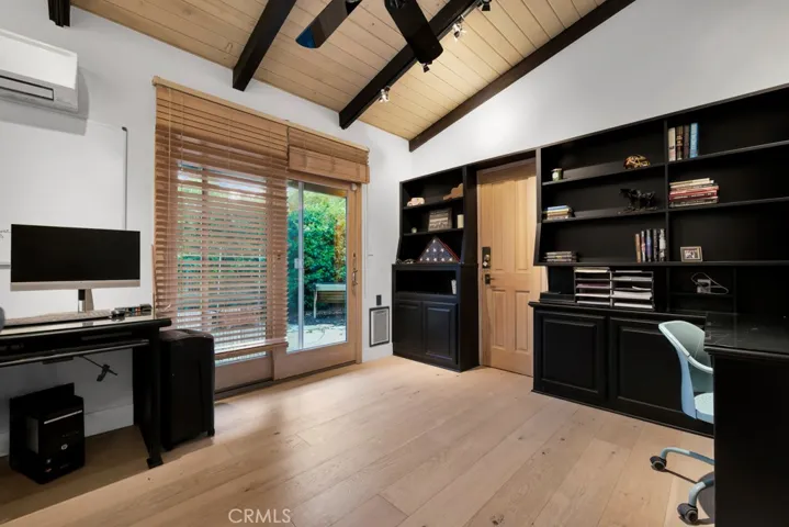 Prepare to fall in love with this incredible home! The large concrete driveway accommodates 6+ cars, providing ample parking. Upon entering through the modern double doors, you’ll be greeted by gorgeous hardwood floors, recessed lighting, and designer touches throughout. The spacious living room boasts a beautiful fireplace adorned with a striking ebony Roman clay finish. This home is designed for seamless indoor/outdoor living, with all bedrooms, the living room, and the family room offering direct access to the backyard. The kitchen features slate tile floors, cherry cabinets, quartz countertops, and high-end stainless steel appliances, including Thermador and Bosch, as well as a wine fridge. Adjacent to the kitchen is the family room, which showcases vaulted ceilings, a skylight, and French doors leading to a tropical paradise in the backyard. The expansive master suite includes a large bathroom with a dual-sink custom vanity, slate tile, a massive spa tub, and direct access to the pool area. The master bedroom features an impressive 8’x28′ closet, ensuring ample space for even the largest shoe collection, along with crown moldings and a stylish accent wall. One of the bedrooms has been converted into a home office equipped with built-in desks and bookshelves, while the other two bedrooms are spacious and share a newly remodeled Jack and Jill bathroom. All bedrooms come with ceiling fans for added comfort. The backyard is an entertainer’s paradise, boasting a tiki theme that will make every day feel like a vacation. Enjoy the sparkling pool and spa, a built-in Viking BBQ, a generous patio area, lush vegetation, and a tiki bar overlooking the pool. Take in the stunning sunsets from the larger of two maintenance-free synthetic wood decks, or escape to the smaller deck hidden among the trees. Additional highlights include a convenient 3/4 bath off the pool, a large laundry room (with newer washer and dryer included), landscape lighting in both the front and back, a 2-car attached garage with a frosted glass door, and an EV charger. All of this in the incredibly desirable neighborhood of Lynn Ranch with only a $200/year VOLUNTARY HOA.