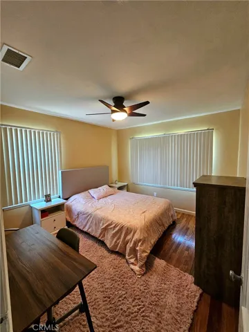 **SOLAR INCLUDED – Lower Electric Bills** The owner pays for solar, allowing you to run the air conditioning without the worry of soaring utility costs. This beautifully updated 3-bedroom, 1-bath residence offers over 1,265 square feet of spacious living, plus a versatile **den or office flex space** ideal for working from home, hobbies, or quiet retreat. Step into an inviting living room featuring refinished original hardwood floors, a classic fireplace focal point, and plantation shutters that blend privacy with timeless style. The kitchen showcases marble-veined quartz countertops, modern gray cabinetry, and a coordinated backsplash. A bay window nook provides the perfect spot for dining or casual mornings. Refrigerator included. The updated bathroom features a shower-over-tub and contemporary vanity. Bedrooms are generously sized; all comfortably accommodate queen-sized beds, and the primary suite offers a full wall of closet space. Additional highlights include a tankless water heater for energy-efficiency and on-demand hot water, in-home laundry with full-size stackable washer and dryer, and an 8×10 storage shed for tenant use. The private backyard offers ample space for entertaining, relaxing, or enjoying time with your pet. Conveniently located near shopping, dining, schools, and freeway access, this home offers excellent walkability and everyday convenience. NOTE: The ADU has been leased. It is detached from the house and does not have use of the fenced-in backyard.