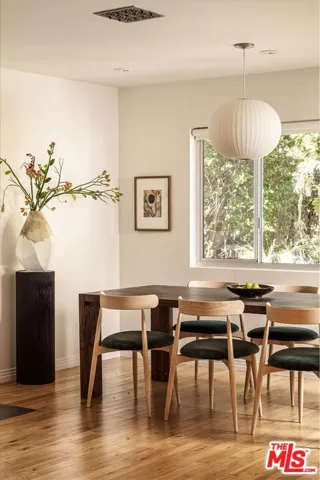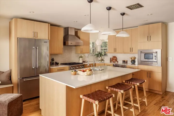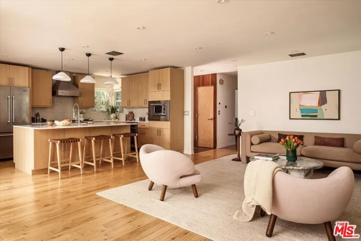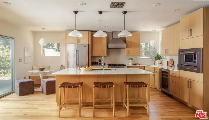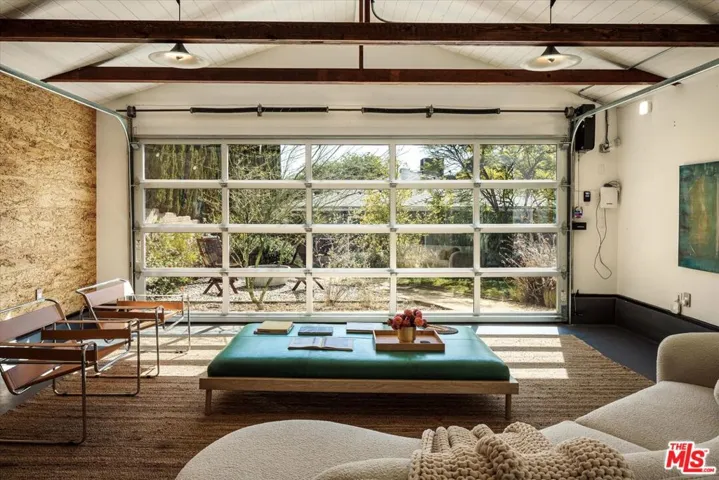 Hidden behind lush landscaping, this Franklin Hills Mid-Century home unfolds like a secluded compound – private, peaceful and effortlessly cool. A flagstone entry invites you into the sophisticated light-filled great room, where large picture windows and sliding glass doors seamlessly connect the open concept living area to a sunlit patio and beautifully landscaped backyard. The chef’s kitchen anchors the space with Viking appliances, custom cabinetry, quartz countertops, and a generous island perfect for hosting. Every detail throughout the home feels intentional, from the walnut paneling, Cle tiled bathrooms, to the custom closet doors and thoughtfully integrated storage. The Terremoto designed garden leads to an expansive detached studio with mini-split system. Formerly a two car garage, it has since been transformed into an eclectic and inspiring flex space with a pitched wood-beamed ceiling, polished concrete floors, a mix of rustic and modern built-in cabinetry, and full-scale cork board wall. A dramatic roll-up glass door floods the room with natural light, opening to the serene surroundings accented by a sculptural concrete fire pit. Beyond the studio you will find the gorgeous outdoor cedar sauna and cold plunge designed by Redwood Outdoors – a fully realized personal spa retreat. This private sanctuary brings the compound full circle, offering an ideal balance of design, comfort, and California ease. Additional upgrades include new roof (2025) HVAC (2022). Just blocks from beloved neighborhood favorites such as Kismet, Little Dom’s, Maru Coffee, All Time, The Vista Theatre – and only minutes to Silver Lake and the 101 freeway- this Franklin Hills gem truly feels like a hidden retreat in the heart of Los Feliz.