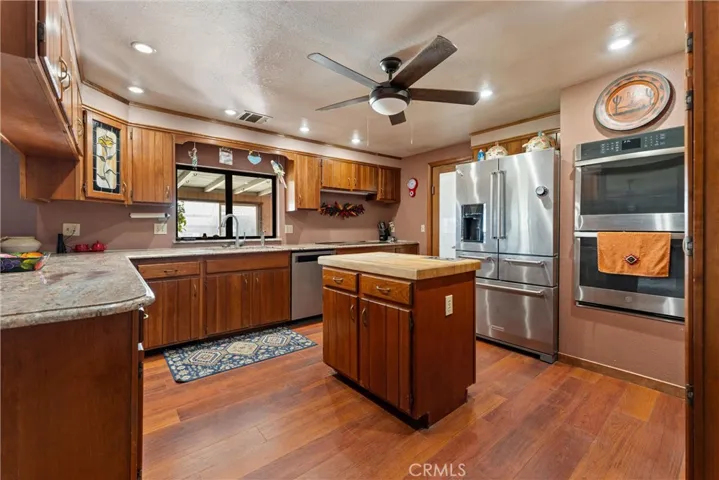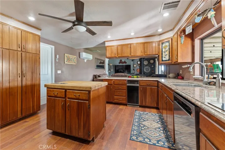 Charming Custom-Built Farmhouse with Premium Features This beautifully crafted custom farmhouse offers all the amenities a modern family could desire. The home features two attached 2-car garages—one 18 feet wide and the other 16 feet wide—both with 7-foot-high doors, and accessible via a convenient circular driveway. For added functionality, there is a separate cemented RV pad complete with a 30-amp plug-in and sewer dump. Inside, you’ll find rich wood flooring that flows throughout the entry, formal living room, and dining area, all offering lovely views of the meticulously landscaped front yard. The inviting family room exudes warmth and comfort with its free-standing wood-burning stove, perfect for cozy evenings. The kitchen is a chef’s dream, featuring wood floors, a butcher block island, granite countertops, and stainless steel appliances. Adjacent to the kitchen is a spacious laundry room offering ample cabinetry and direct access to both the garage and backyard. The guest bathroom features a strikingly large farmhouse sink, while the bedrooms are generously sized. The primary suite includes two separate mirrored closets and an updated en-suite bathroom with a beautiful glass-tiled shower. This thoughtfully designed home combines modern convenience with classic farmhouse charm—perfect for comfortable family living and entertaining. This versatile space is equipped with a professionally installed mini-split cooling system and a pellet stove, making it perfect for relaxing or entertaining in any season.