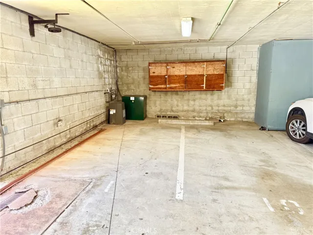 Two car parking spaces, side by side in a gated parking garage with storage cabinets.