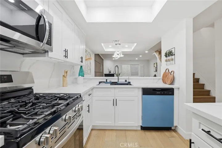 Step inside to discover an open and airy floor plan with warm wood flooring, high ceilings, recessed lighting, and a cozy fireplace. The updated kitchen features stainless-steel appliances, a breakfast bar, and plenty of storage, perfect for everyday living or entertaining guests.