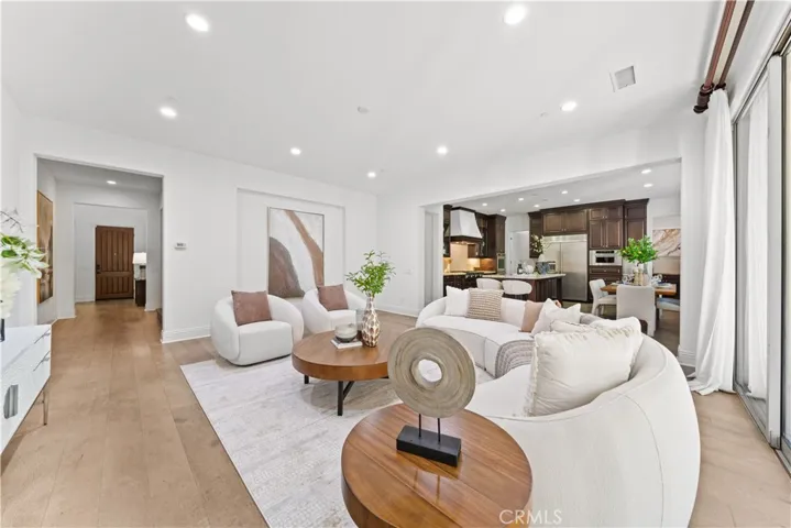 The gourmet chef’s kitchen is equipped with stainless steel appliances and features an expansive layout, perfect for preparing meals for a large family. From the main living area, panoramic sliding glass doors seamlessly connect to the spacious backyard, inviting effortless enjoyment of the coveted California indoor-outdoor lifestyle.