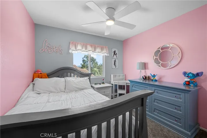 Upstairs, the primary suite offers an ensuite bath with dual sinks and an updated walk-in closet. Two additional spacious bedrooms feature ceiling fans and mirrored closets, and a versatile fourth bedroom, currently utilized as a home office and theater room, includes a built-in desk, cabinets, shelving, and ample storage. Ceiling fans in all bedrooms and a full bathroom ensure comfort throughout.