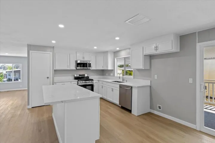 Freshly remodeled home located in a 55+ park with rent control and beautiful amenities! This home features a spacious Living room, formal Dining room, and an additional Family room / Den that is open to the beautifully remodeled Island Kitchen, plus two primary bedrooms, each with it’s own ensuite remodeled Bathroom! Both Bedrooms feature a walk in closet. The main Bathroom features double sinks and a large custom shower! The home also boasts new exterior paint, new dual pane windows, LVP floors throughout, quartz counter tops, new exterior doors, new recessed lighting and fixtures, new stainless steel appliances, and so much more! The exterior has one storage shed, a covered porch, and a low maintenance yard. This rent controlled community has a clubhouse, a pool that is heated year round, jacuzzi, billiards, library, shuffle board & a dog park. Conveniently located near Costco, Walmart, Kohls, grocery stores, dining, public transportation, both the Palomar Hospital and new Kaiser hospital & medical offices, and more! Low space rent of only $710.70 per month. One resident must be 55+, while the second resident can be 40+. One indoor pet under 25 lbs is welcome with prior management approval.