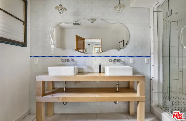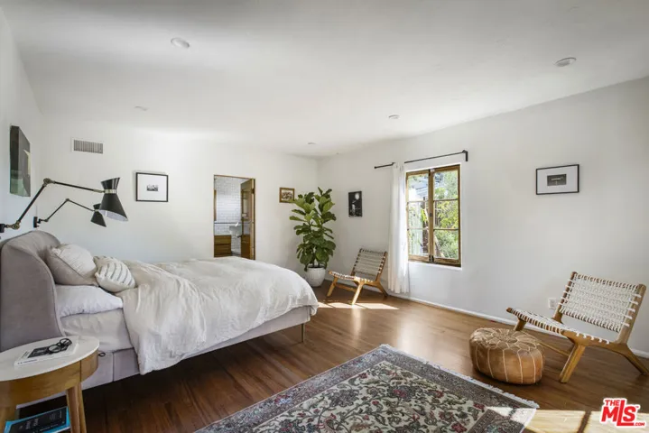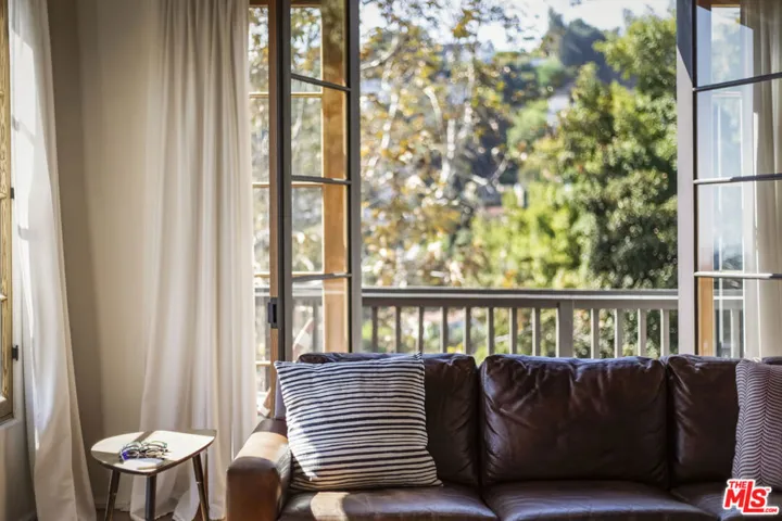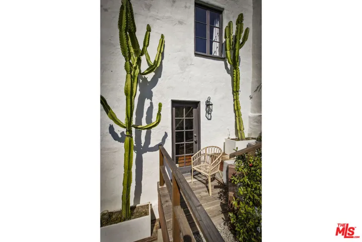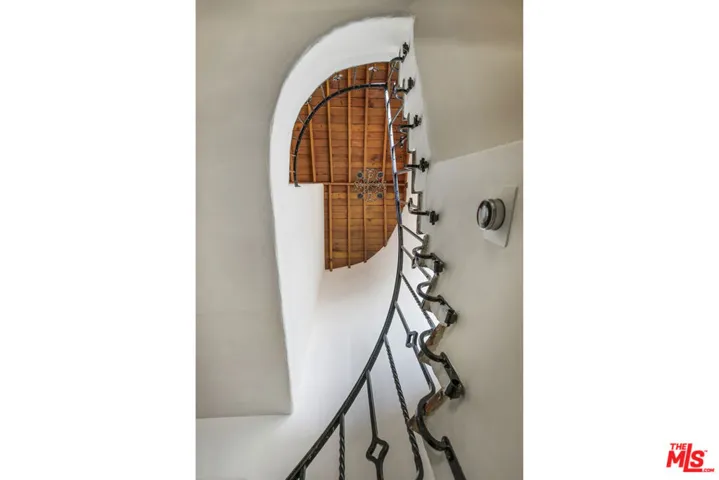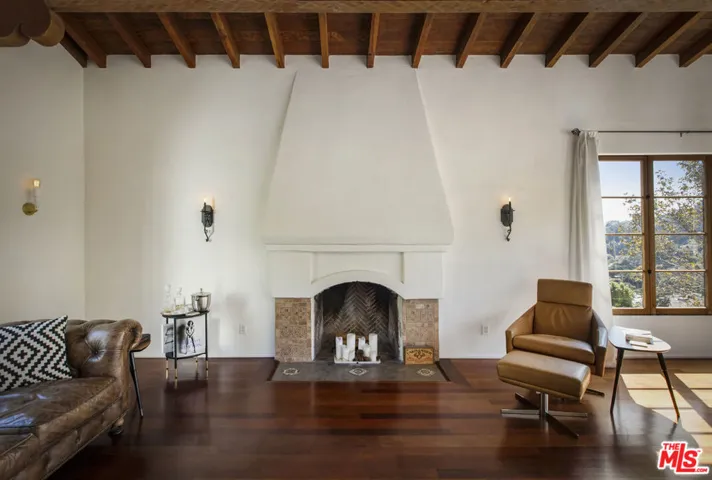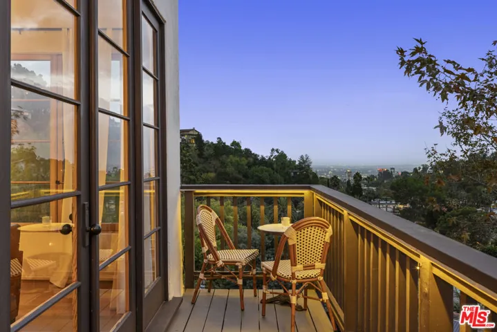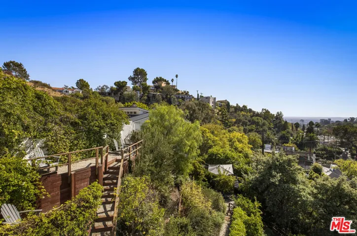 This classic Hollywoodland Spanish Colonial Estate circa 1928 is sited with privacy and bathed in natural sunlight offering stunning original character, sensational views of the canyon and city lights, spacious bright rooms and a full separate parcel landscaped as a private park with meandering paths and a myriad of fruit and flowering specimens. The gated courtyard at street level leads to tiled grand formal entry and dramatic living room with towering wood beamed ceiling, authentic stone fireplace, and original casement windows and French doors leading to a romantic balcony to take in the view. Unique pentagonal dining room opens to balcony and spacious eat-in cooks’ kitchen, with vaulted wood beamed ceiling, chef’s appliances, large breakfast area plus butler’s pantry. Stunning tiled staircase leads to middle level with an office and three bedrooms including a luxurious primary suite; with large bedroom and gorgeous vintage style black-and-white en suite bath with floor to ceiling tiles, double sink and separate tub and shower. The third level features flex space with three spacious bright original rooms with high ceilings and natural light: including an office/library with exterior entrance, a second living room opening to a large patio; and separate family room/4th bedroom with oversized tiled bath. All three levels feature flow to outdoor covered and open balconies. This property includes a second parcel with its own APN that has been transformed to an outdoor wonderland navigated on foot through dozens of varieties of fruit, rosemary, lavender and wild sage. Entertain large groups outdoors in the lower area of the lot featuring a huge tiled patio with built-in grill. Original hardwood floors, unpainted casement doors and windows, vintage Spanish tile, built-ins, hand crafted wrought iron, and clay tile roof are some of the classic hallmarks of this historic home. Additional bonus room w/half bath. A short walk to the village offers a neighborhood cafe and grocery. An impeccable original offering beauty, ease and comfort.